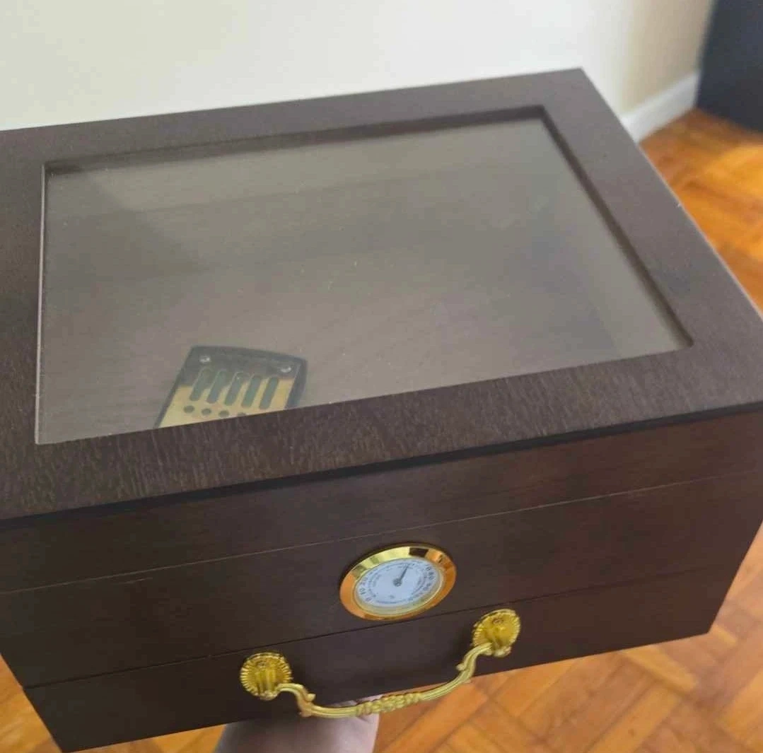 I'm selling a wooden humidor that's perfect for storing your cigars. It features a built-in hygrometer to help you monitor the humidity level, ensuring your cigars stay in optimal condition. The humidor has a glass top and a handle.