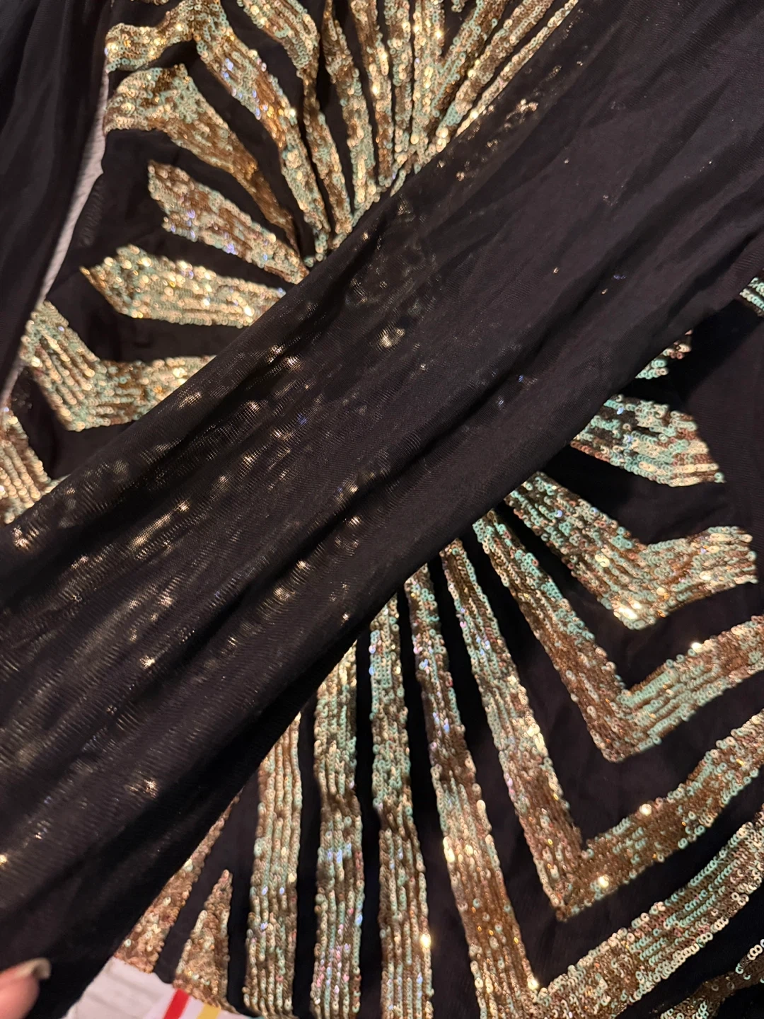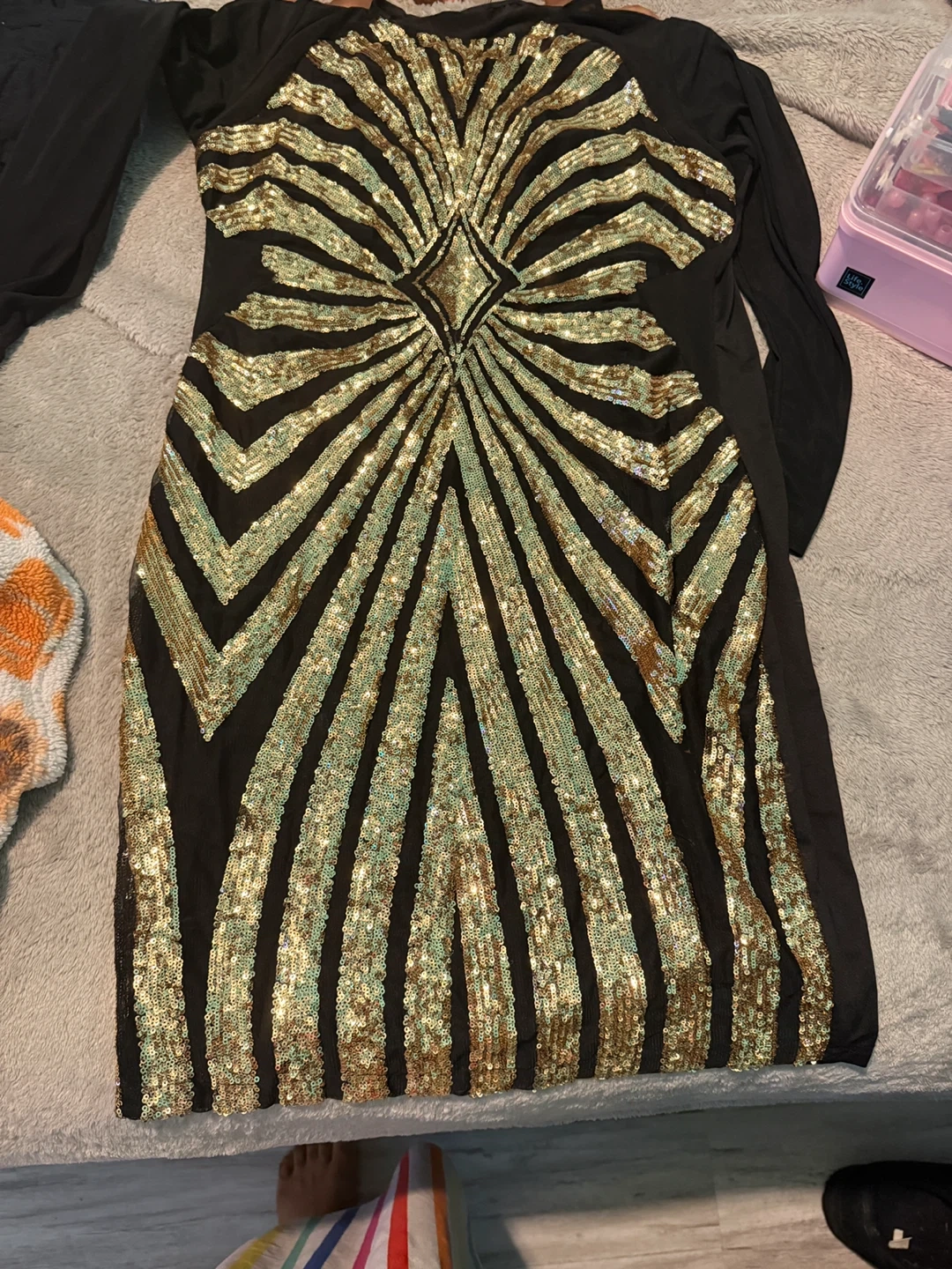 Selling a fun and sparkly black dress with gold sequins! It's perfect for a night out or a special occasion. The dress has long sleeves and a unique design. It's in great condition and ready for a new home Size XL