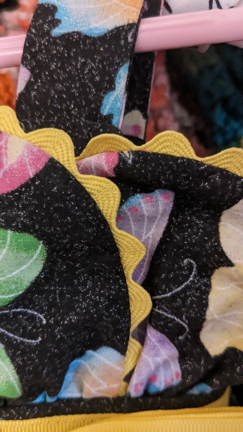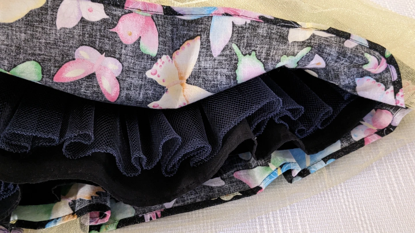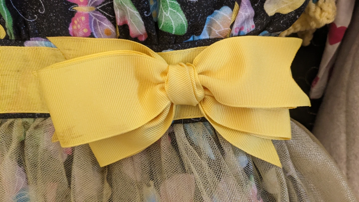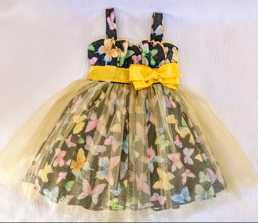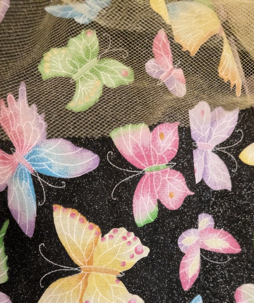 Beautiful dress with multicolor butterflies on a black sparkle background