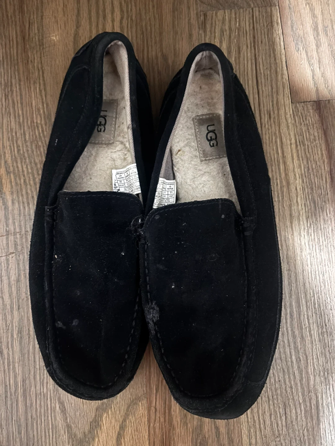 Selling a pair of UGG Men's Ascot slippers in black. They show some signs of wear, as you can see in the photos, but still have plenty of life left! These are super comfortable and great for wearing around the house.
