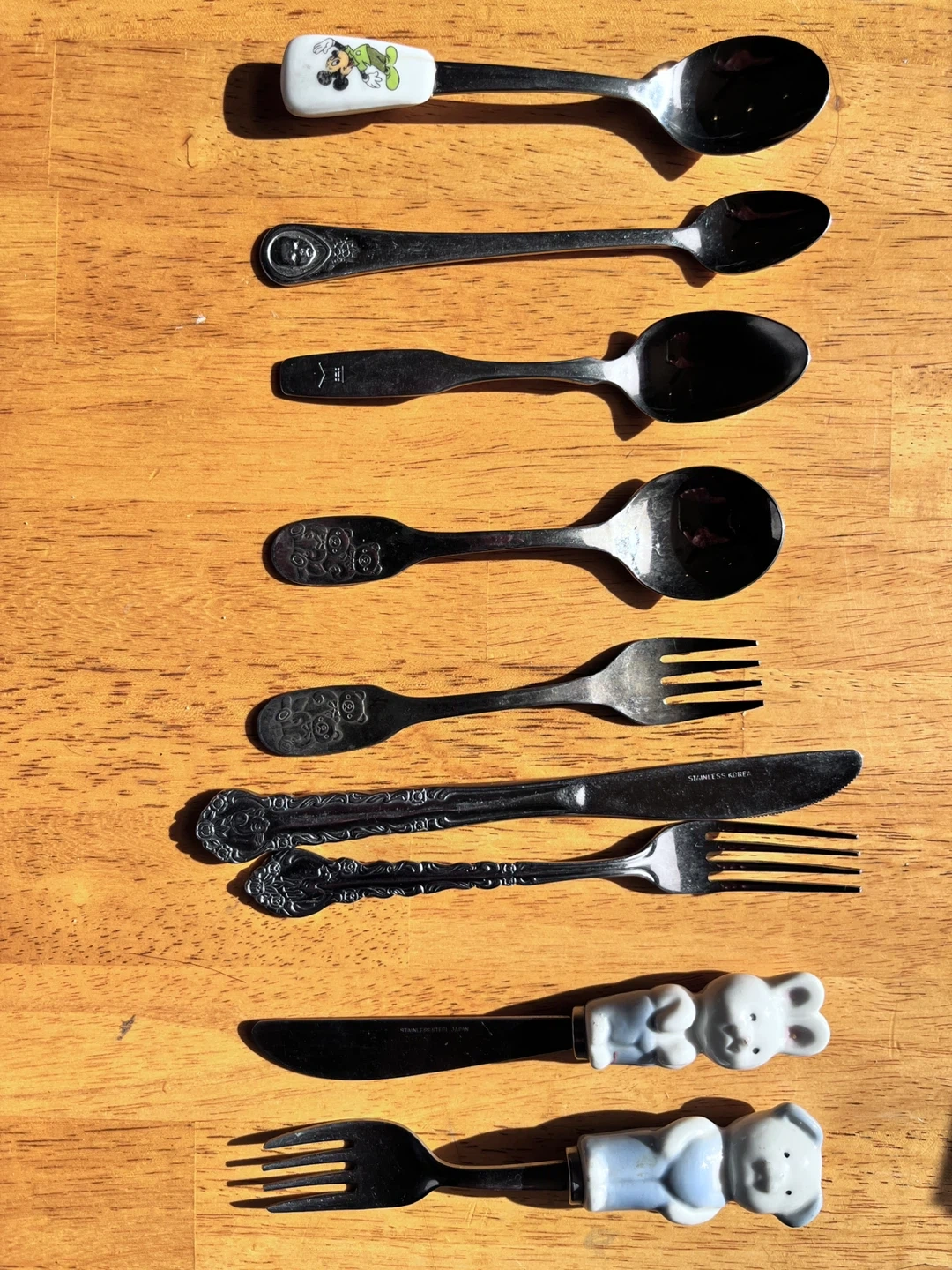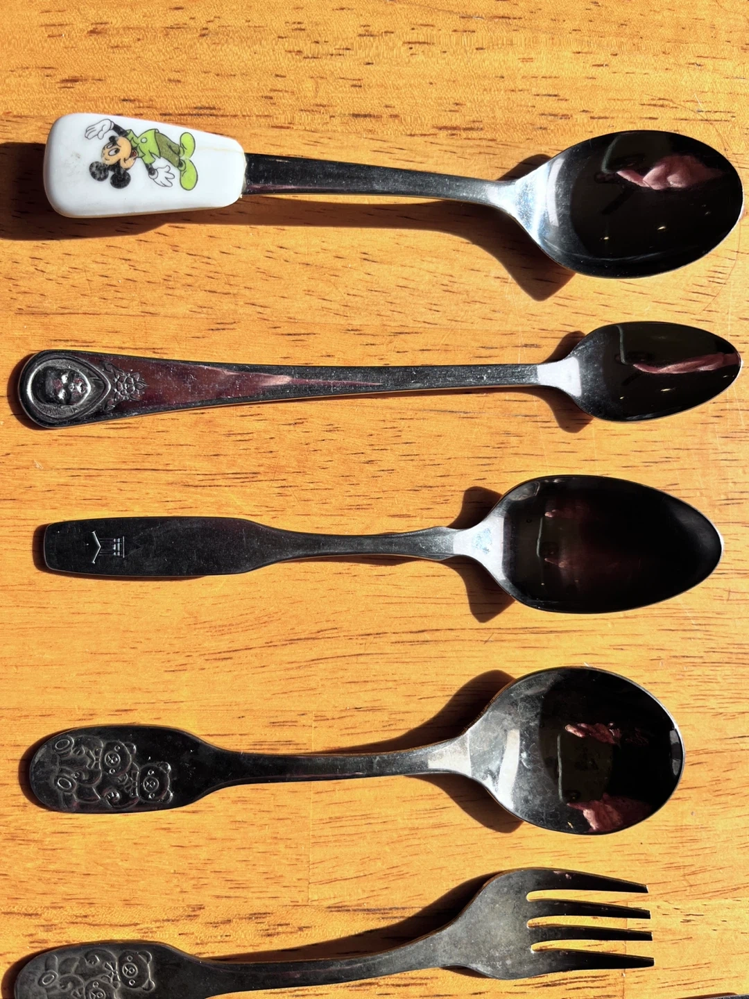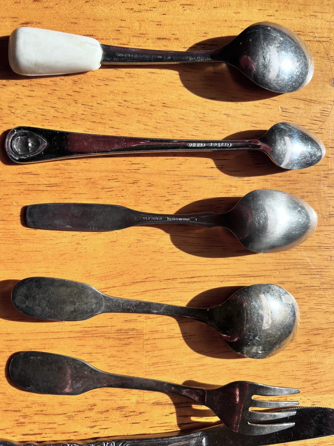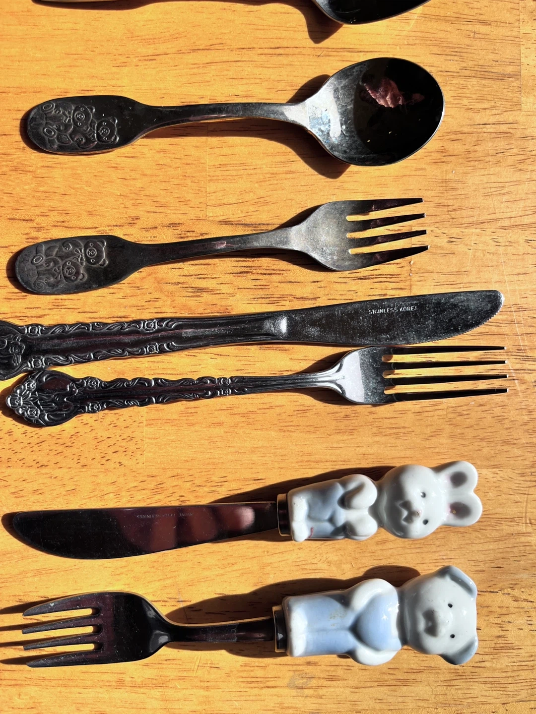 65Selling a mixed set of vintage children's silverware! Includes feeding spoons, forks, and knives. Cute character designs are great for adding some fun to meal times! Vintage silver plated Gerber baby feeding spoon with Gerber baby engraved in a wreath design. Stamped GERBER CHINA Vintage teddy bear baby feeding spoon and fork. No marque Vintage animal and rose engraved baby feeding knife and fork. The knife shows a rabbit and the fork has a deer. Stamped STAINLESS KOREA. Vintage Community stainless steel toddler feeding spoon. A bell tower is engraved on the handle. Vintage rabbit knife and teddy bear fork, marked STAINLESS JAPAN. Vintage Walt Disney Childs Mickey Mouse Spoon. Stamped JAPAN STAINLESS WALT DISNEY PRODS. All pieces have minor wear from use and age, as shown in the photos. The silver plated pieces also show tarnish. As is, $25 for all together.