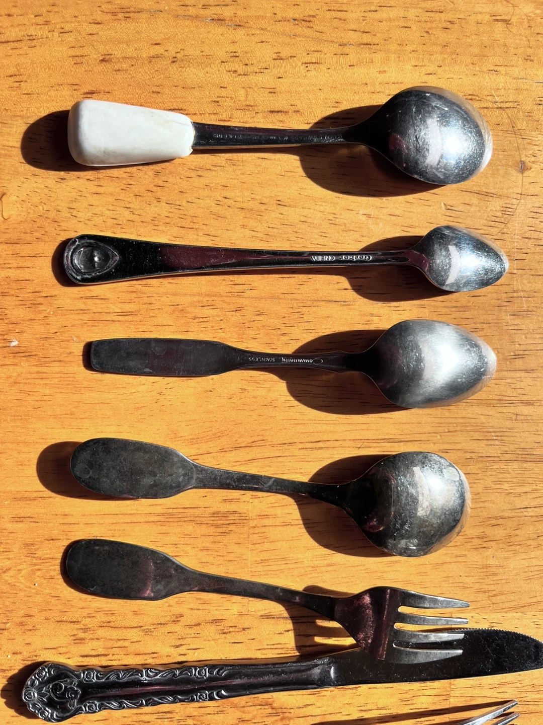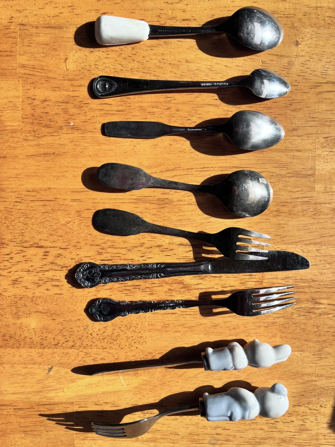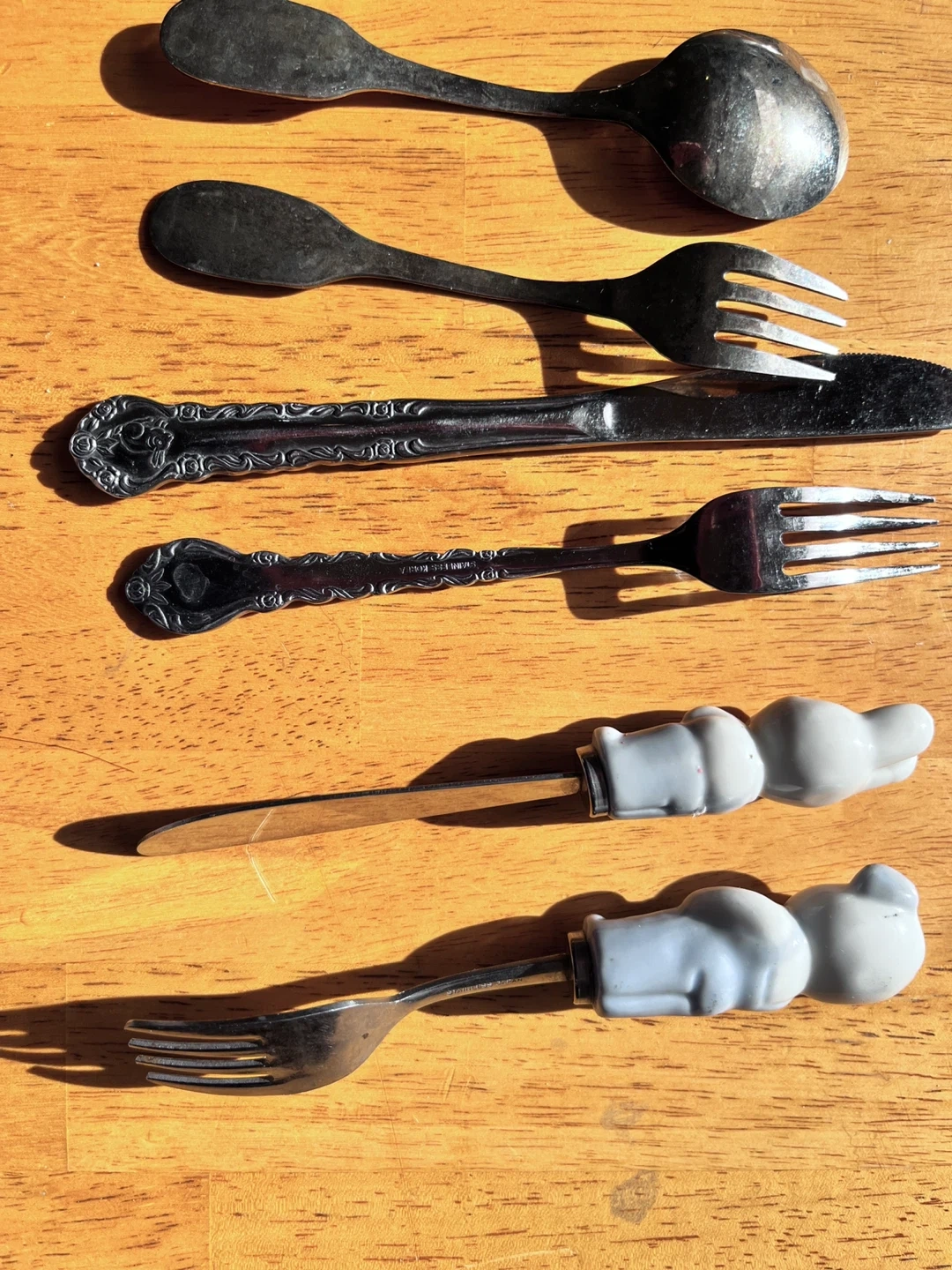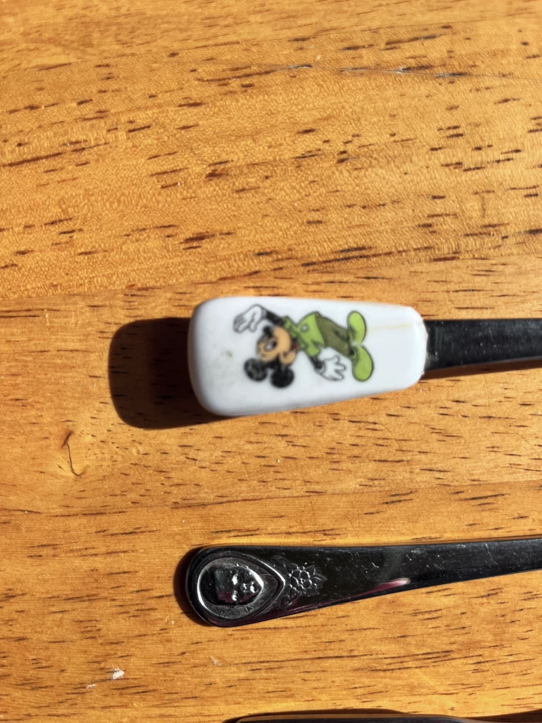 65Selling a mixed set of vintage children's silverware! Includes feeding spoons, forks, and knives. Cute character designs are great for adding some fun to meal times! Vintage silver plated Gerber baby feeding spoon with Gerber baby engraved in a wreath design. Stamped GERBER CHINA Vintage teddy bear baby feeding spoon and fork. No marque Vintage animal and rose engraved baby feeding knife and fork. The knife shows a rabbit and the fork has a deer. Stamped STAINLESS KOREA. Vintage Community stainless steel toddler feeding spoon. A bell tower is engraved on the handle. Vintage rabbit knife and teddy bear fork, marked STAINLESS JAPAN. Vintage Walt Disney Childs Mickey Mouse Spoon. Stamped JAPAN STAINLESS WALT DISNEY PRODS. All pieces have minor wear from use and age, as shown in the photos. The silver plated pieces also show tarnish. As is, $25 for all together.