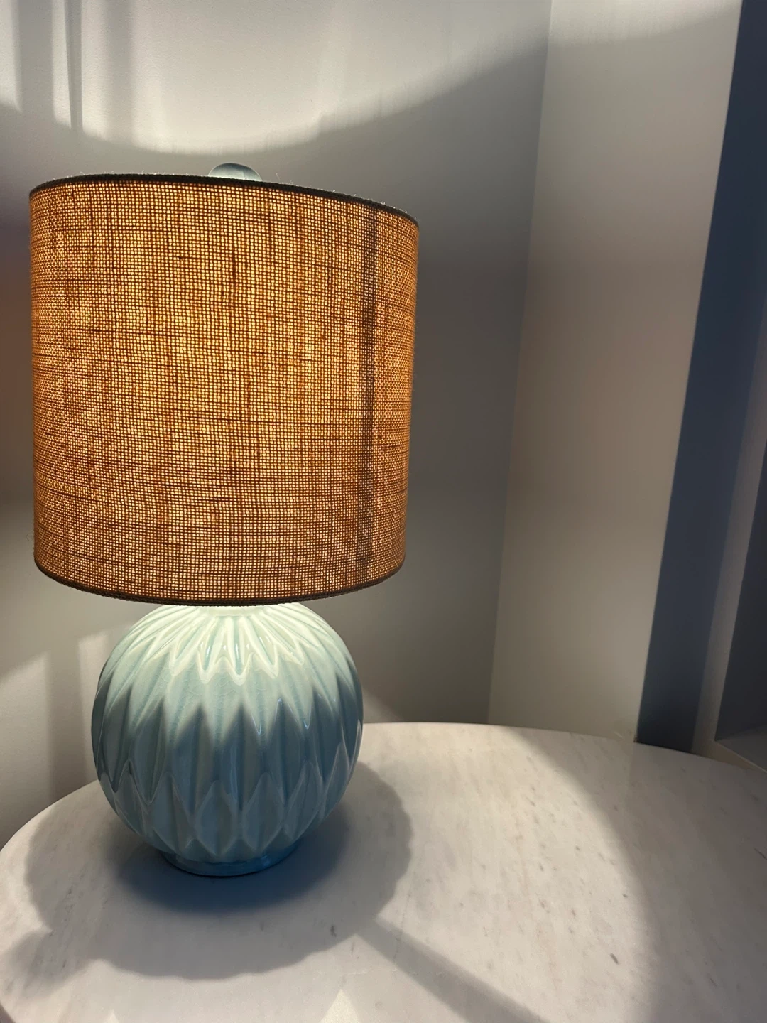 Here's a lovely table lamp that would look great in any room! It features a unique, textured woven shade and a light blue ceramic base. It's in great condition and ready to brighten up your space