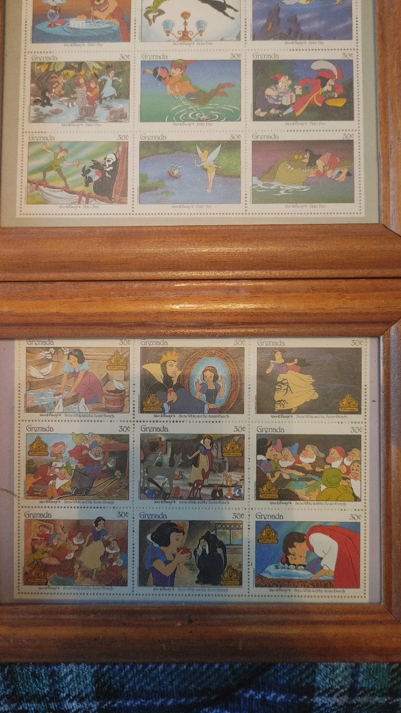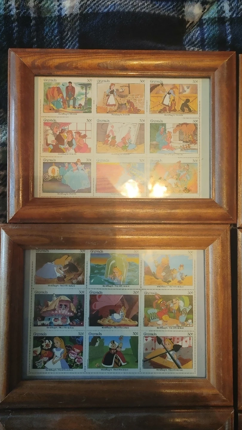 I'm selling a collection of framed Disney animated film character postage stamps. They feature characters from various Disney movies. The stamps are from Grenada and St. Vincent.