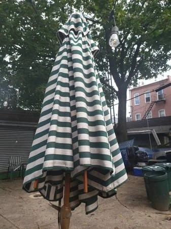 Green & ivory Patio extension table that seats 6 to 10 people with 6 chairs & washable outdoor cushiobs with matching umbrella & stand.