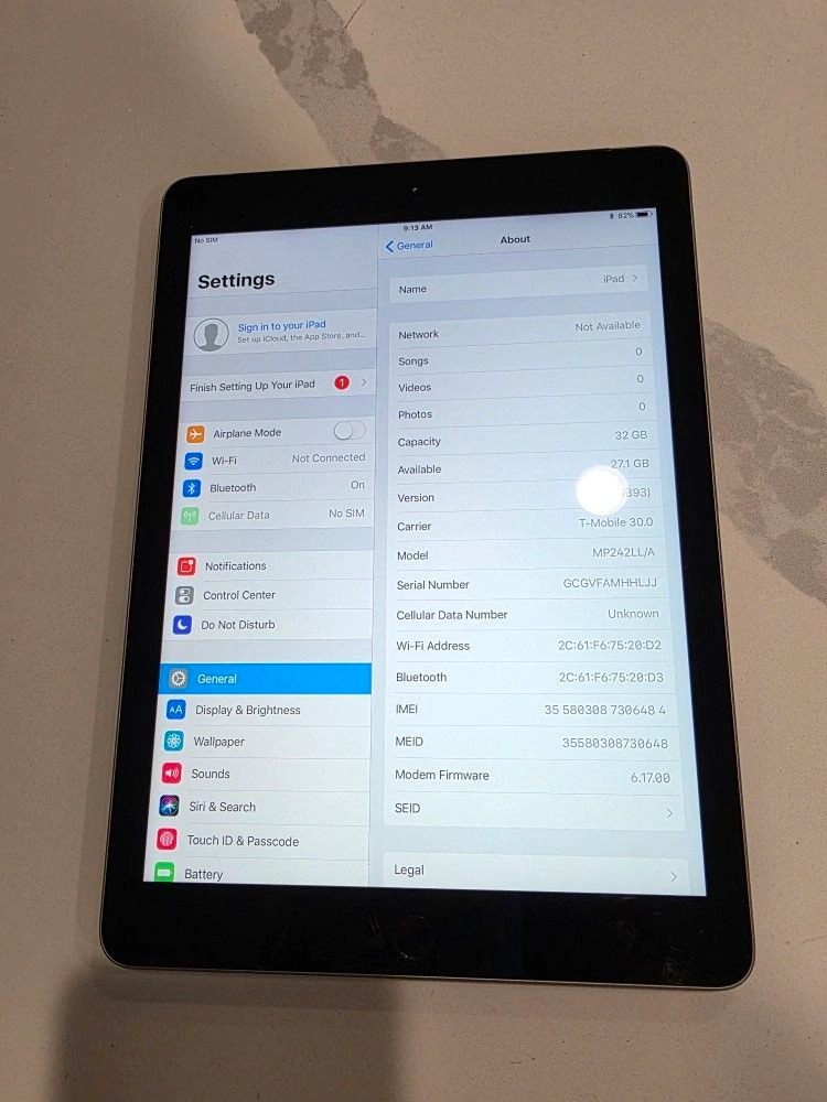 23Excellent condition. Fully functional and unlocked for any carrier. Screen Size: 9-10.9 in Internet Connectivity: Wi-Fi + 4G Model: Ipad 5th gen Storage Capacity: 32 GB Brand: Aple