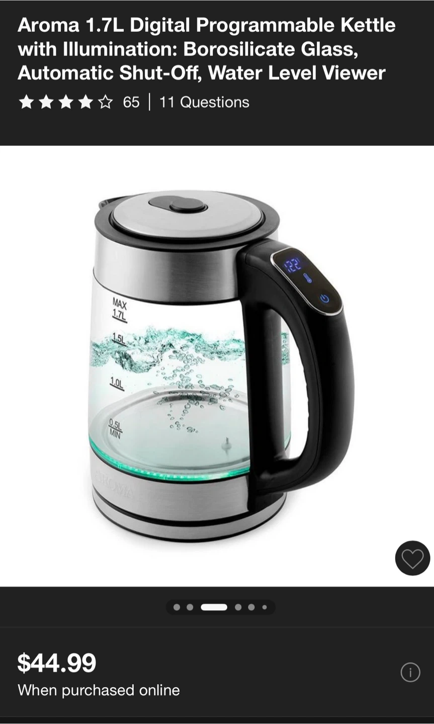 I'm selling an Aroma 1.7L digital programmable kettle. It features borosilicate glass, automatic shut-off, and a water level viewer. It was originally purchased online for $44.99