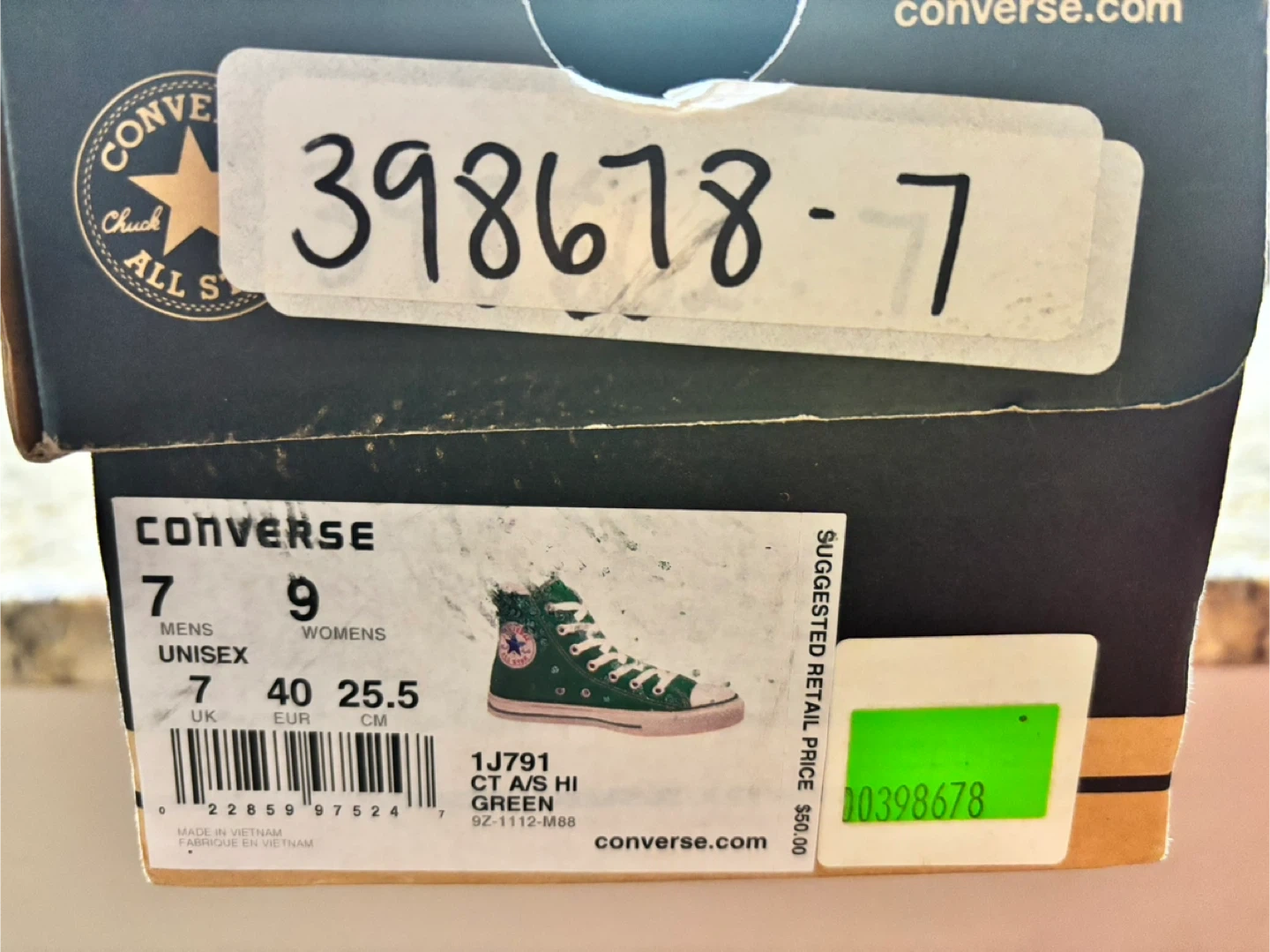 Selling a pair of green Converse Chuck Taylor All Star high-tops! These are a men's size 7 (US). The box is included. Great for adding a pop of color to your wardrobe!