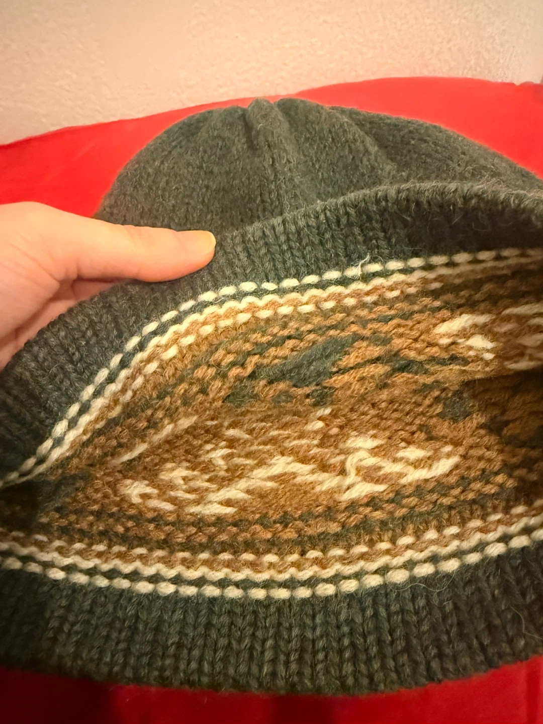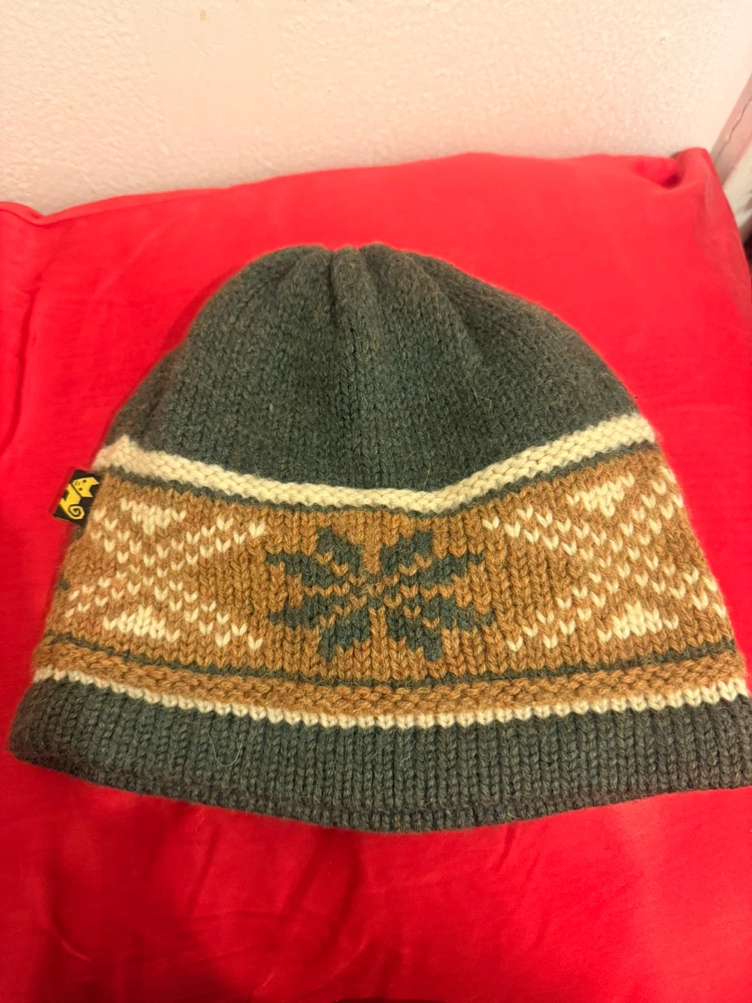 This is unisex handmade wool beanie. It features a unique snowflake pattern in brown and cream colors, set against a green background. It's perfect for keeping warm during the colder months!