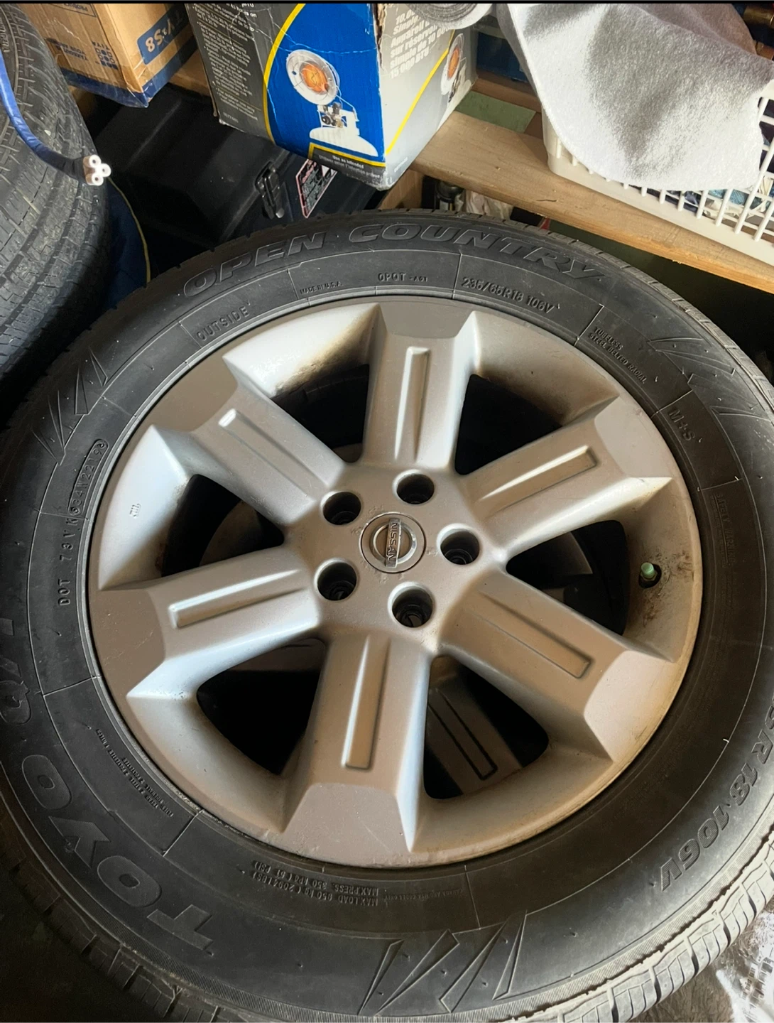 Selling a set of four Nissan rims with Toyo Open Country tires. Tire size is 235/65R18. They're used but still in good condition and ready to roll! These are all-season tires!!!