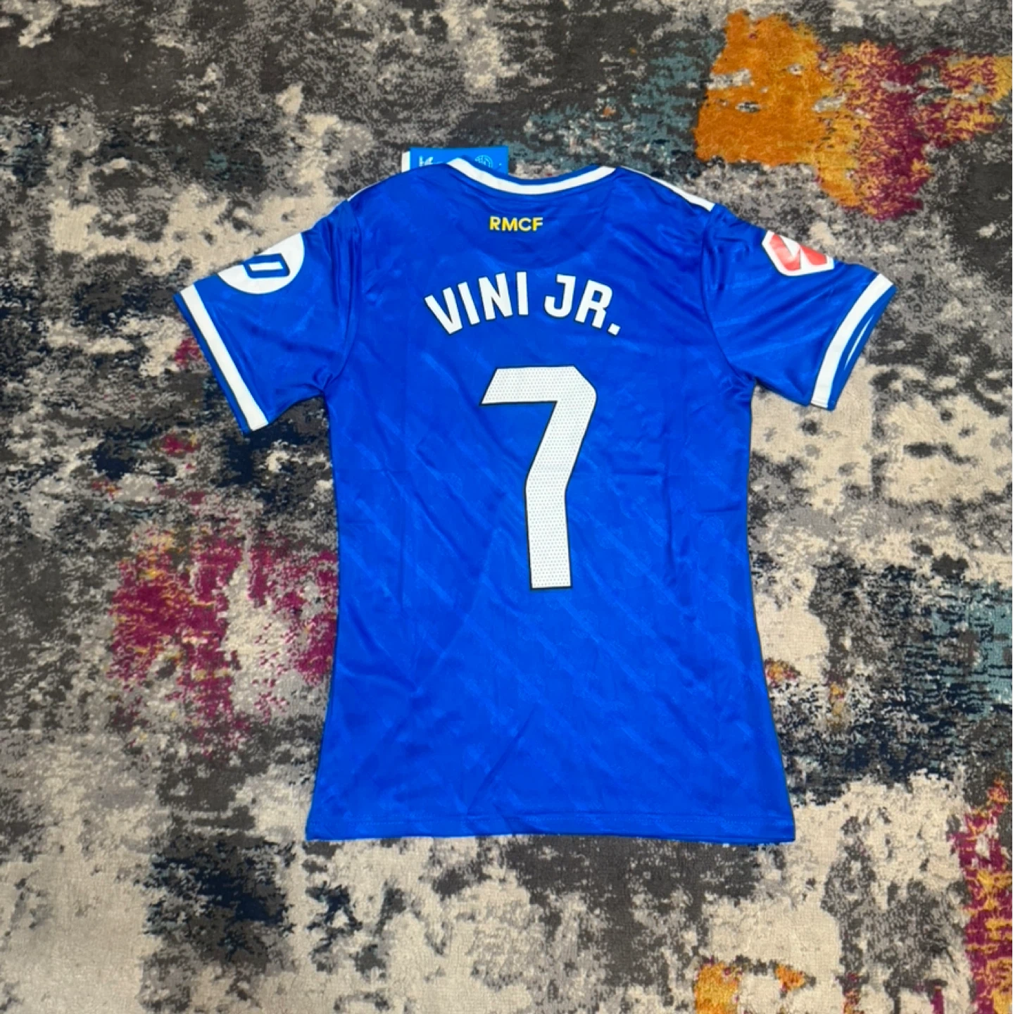 Selling an Adidas Real Madrid jersey with Vini Jr.'s name and number on the back! The jersey is blue and features the Emirates Fly Better logo on the front. It also has the Real Madrid crest. Perfect for any fan!