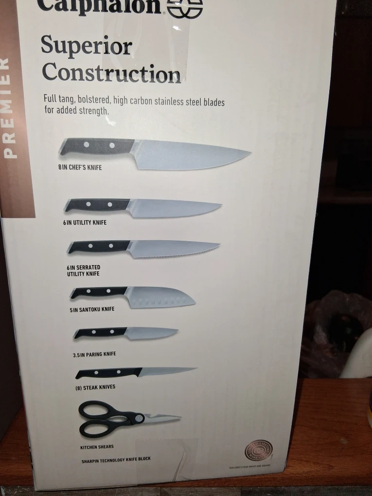 Selling a brand new Calphalon Premier 15-piece knife set! The knives stay sharp for a lifetime with Sharpen Edgetech. This set includes a spring-loaded sharpener, ensuring your knives are always ready to use. The box is included