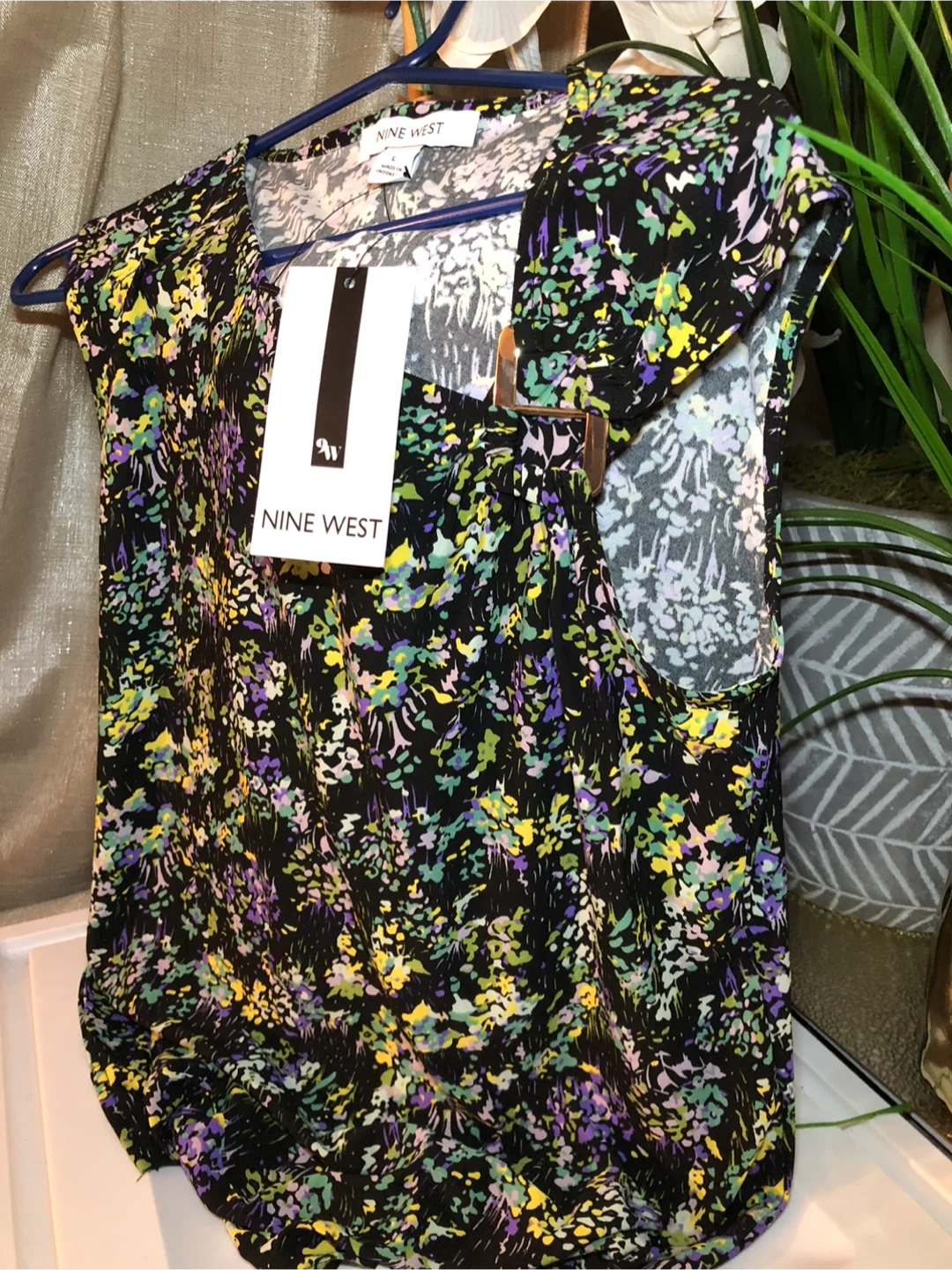 I'm selling a beautiful Nine West sleeveless top in size L. It features a vibrant floral pattern on a black background. The top is in great condition and ready for a new home!