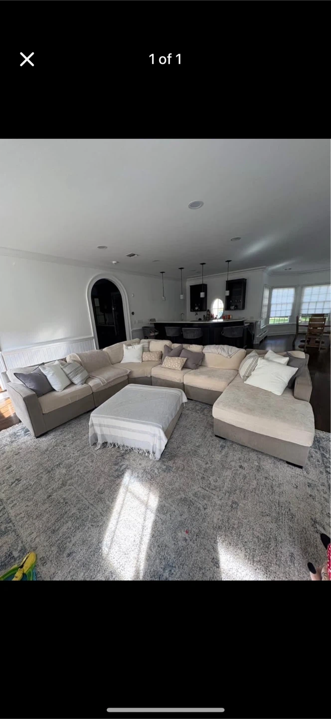 Selling a large sectional sofa. It's in good condition and would be perfect for a large living room or family room. The color is a neutral beige/gray tone. It's a comfortable and stylish piece of furniture! Picture shown with covers and will include in price!
