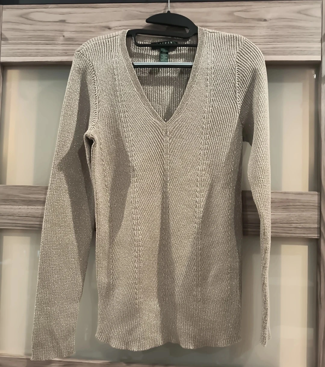 Selling a Ralph Lauren knit sweater in size large! It has a metallic sheen and is made of 70% cotton and 30% polyester. It's in great condition and ready for a new home!