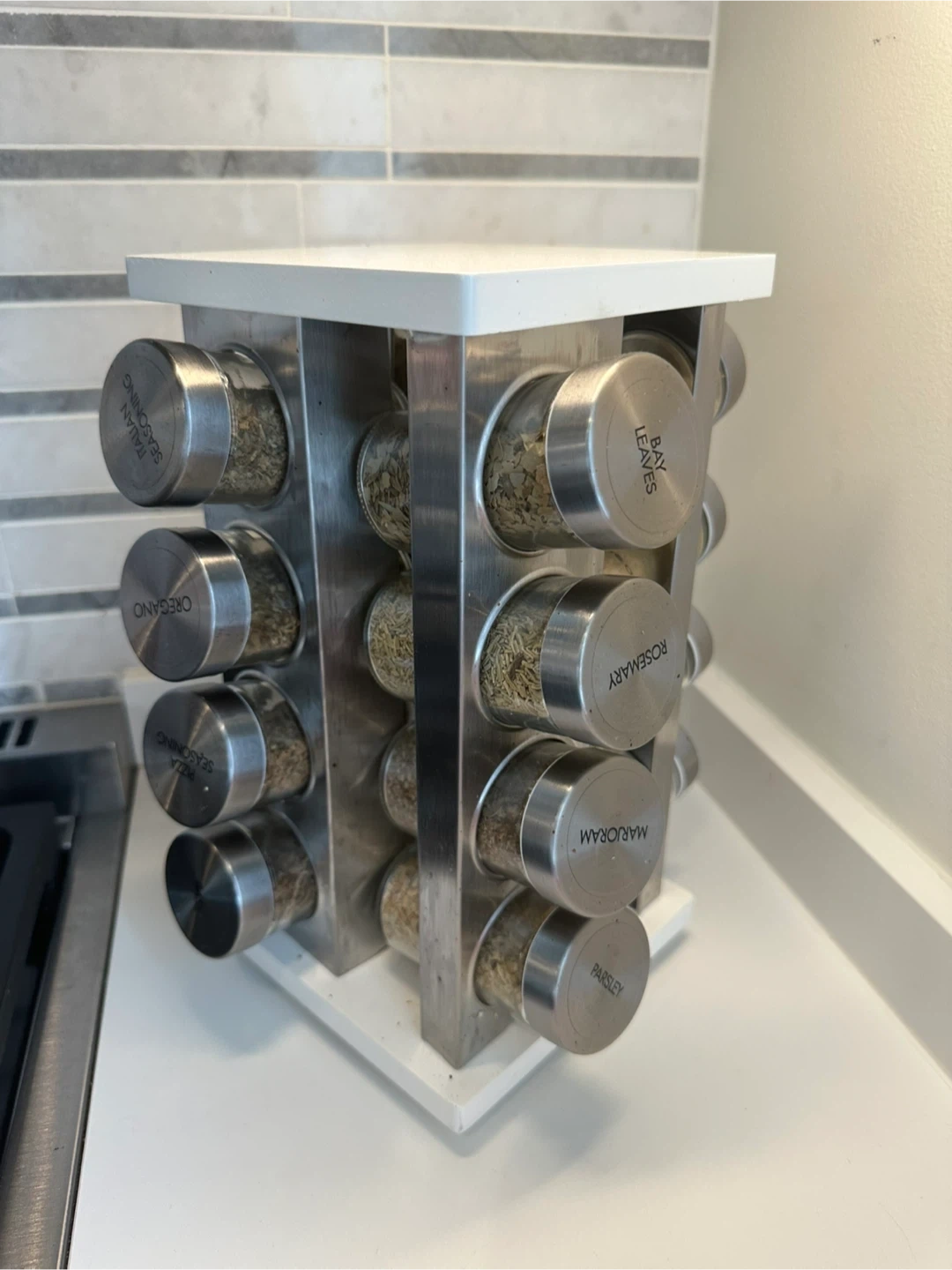 Spice up your kitchen with this rotating spice rack! It comes with a variety of jars filled with different spices, including bay leaves, rosemary, oregano, parsley, and more. It's a great way to keep your spices organized and easily accessible while cooking