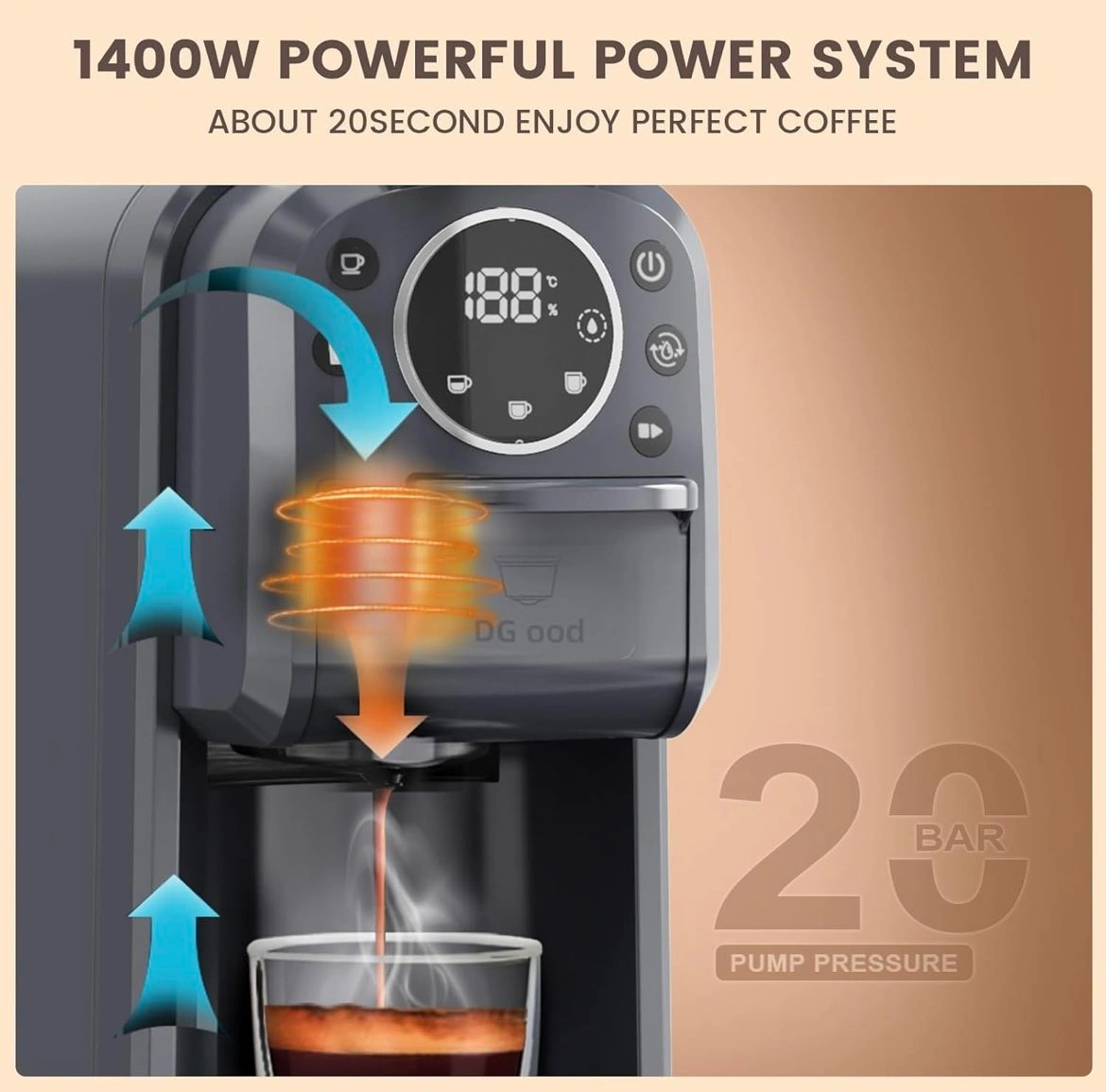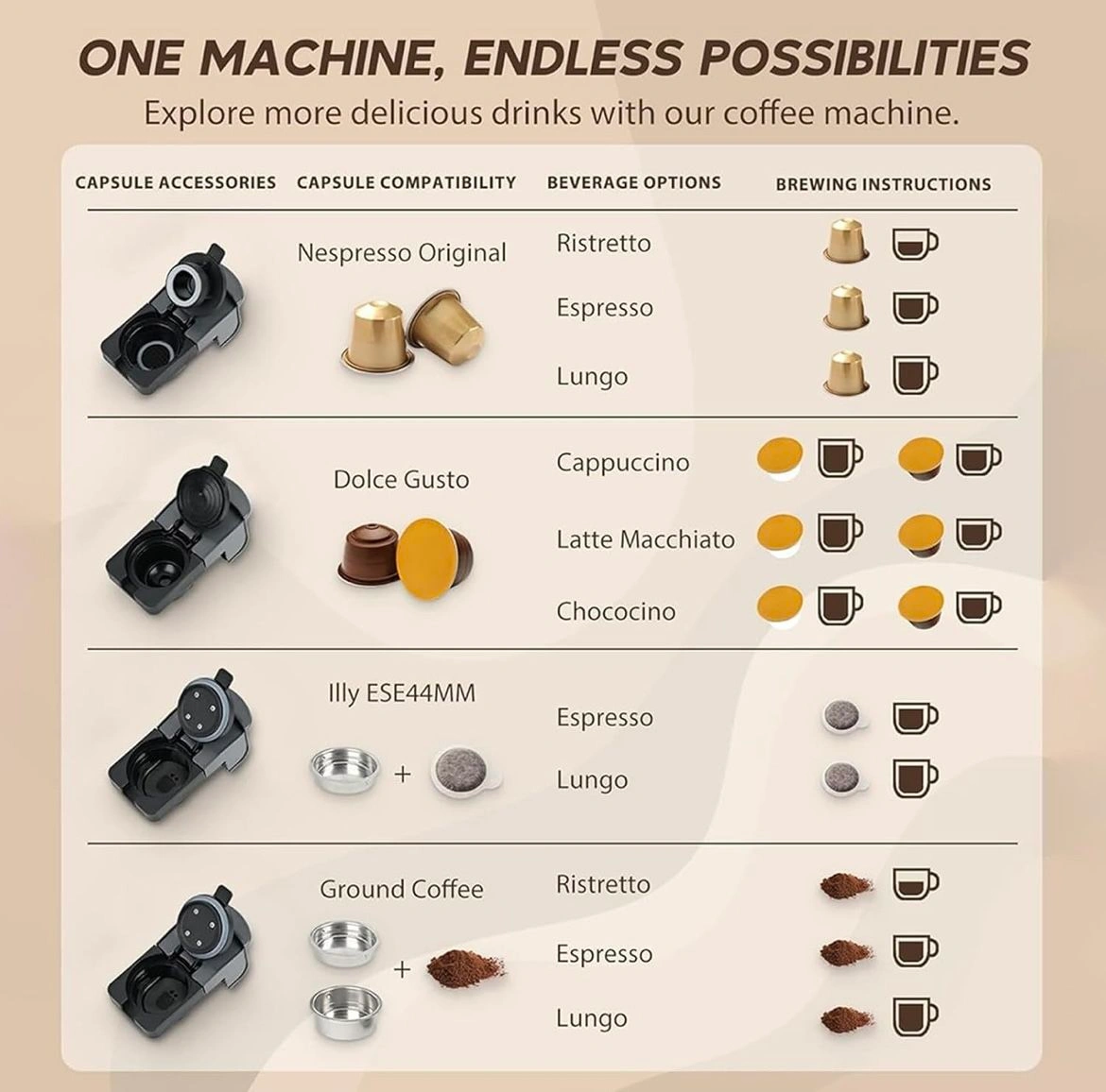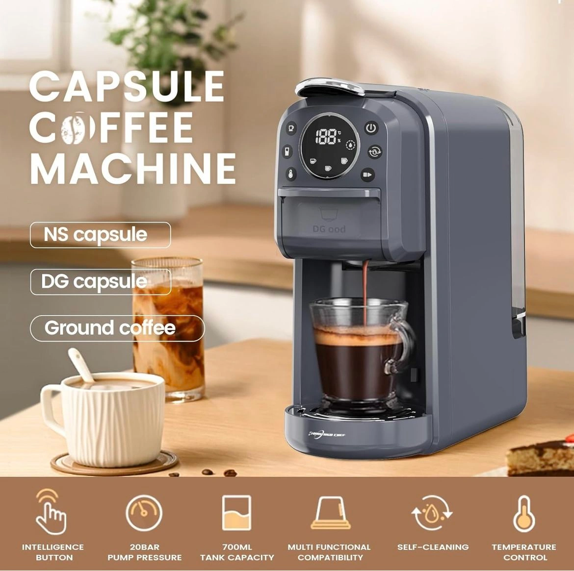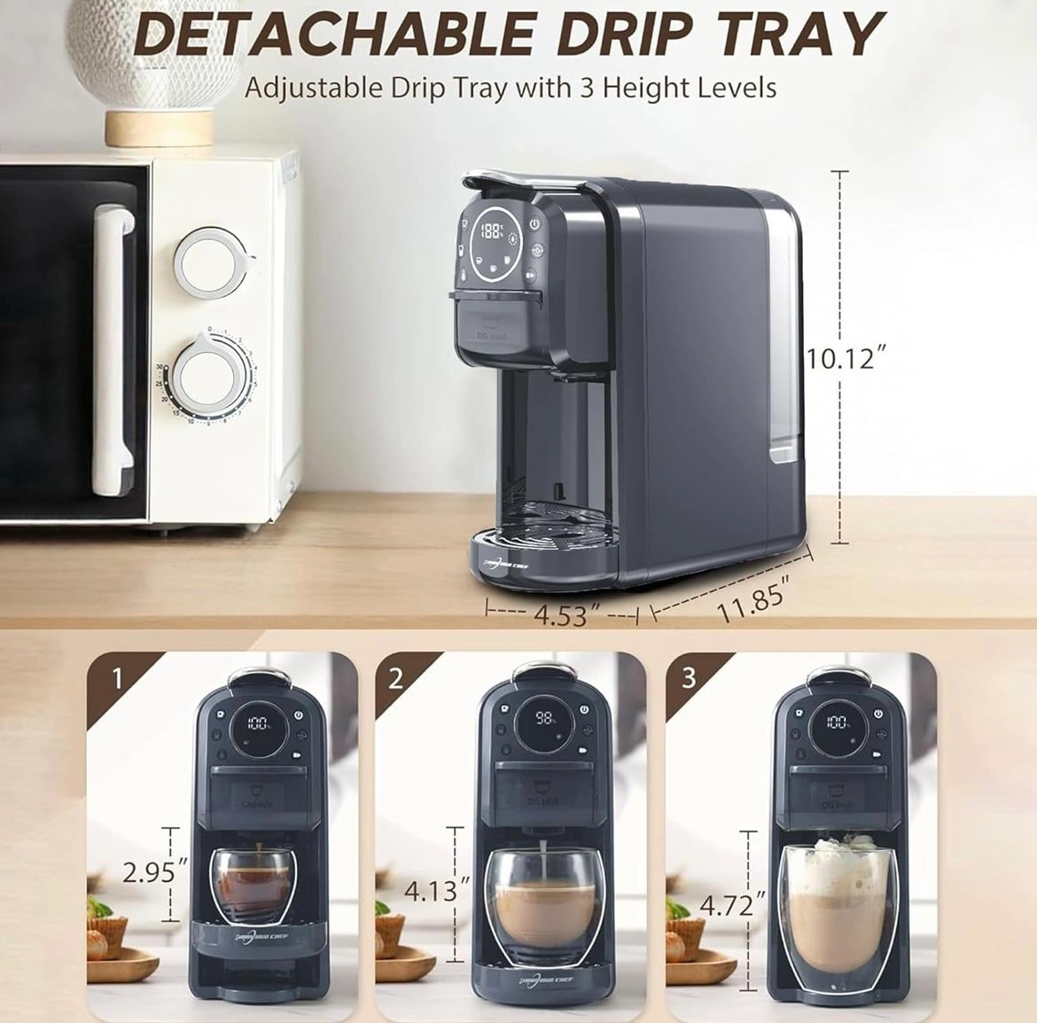 15Open box Single Serve Coffee Machine for Nespresso, Dolce Gusto, ESE Pods & Ground Coffee or Hot Water, Smart & Compact Design in Any Space, 20Bar, CM-C05A.