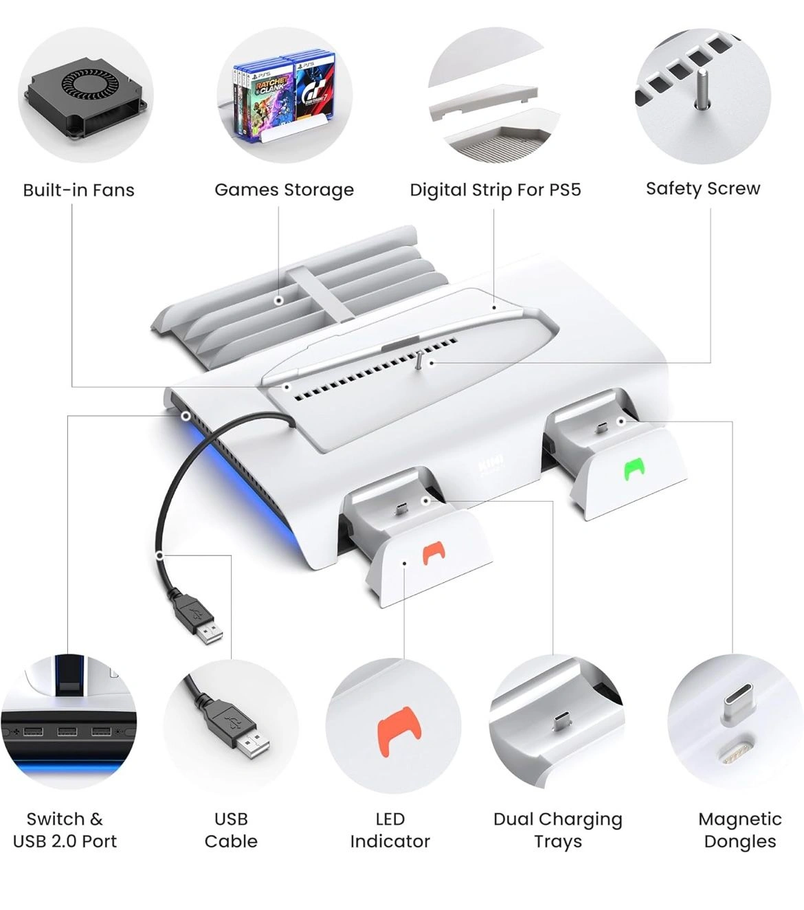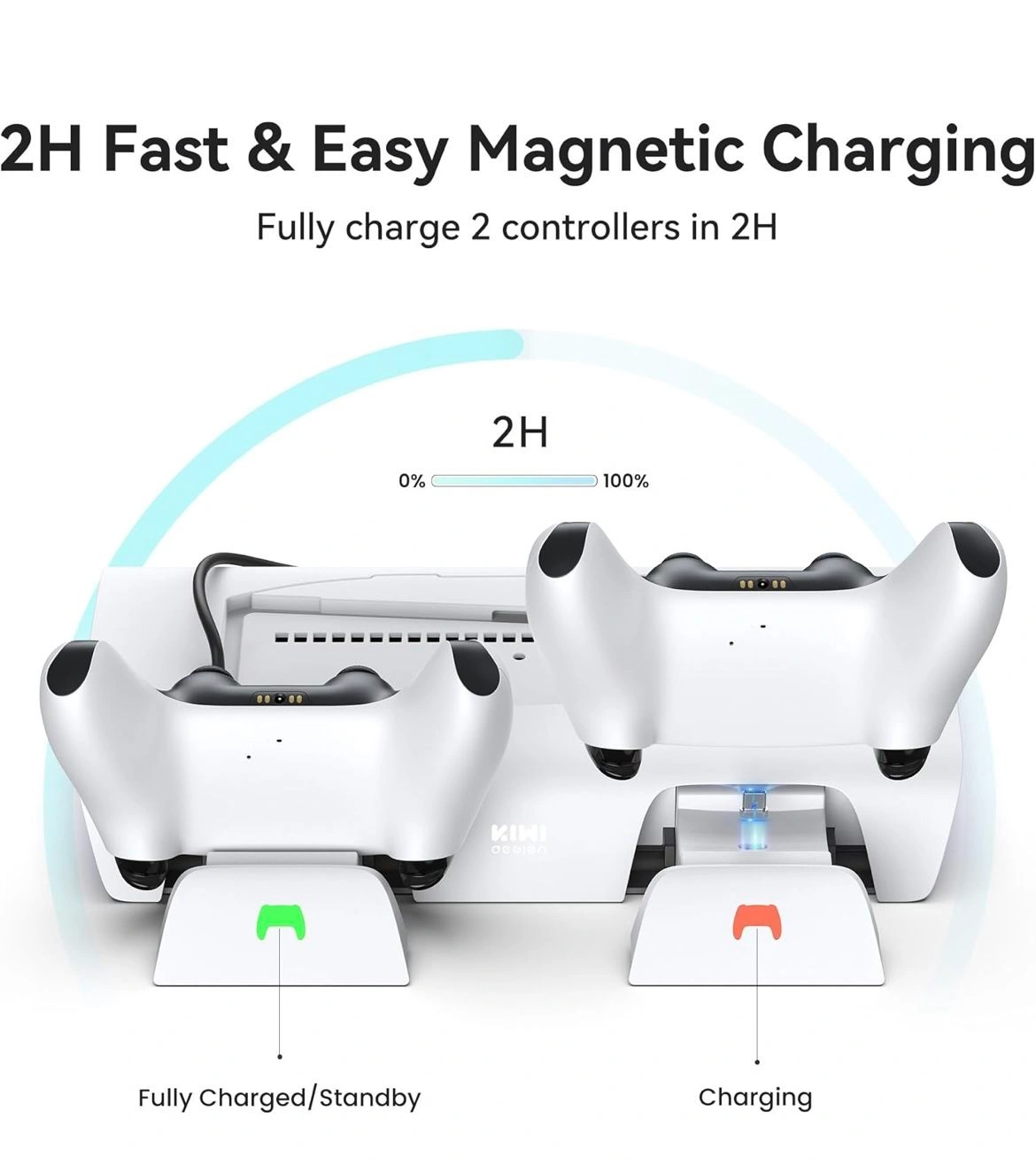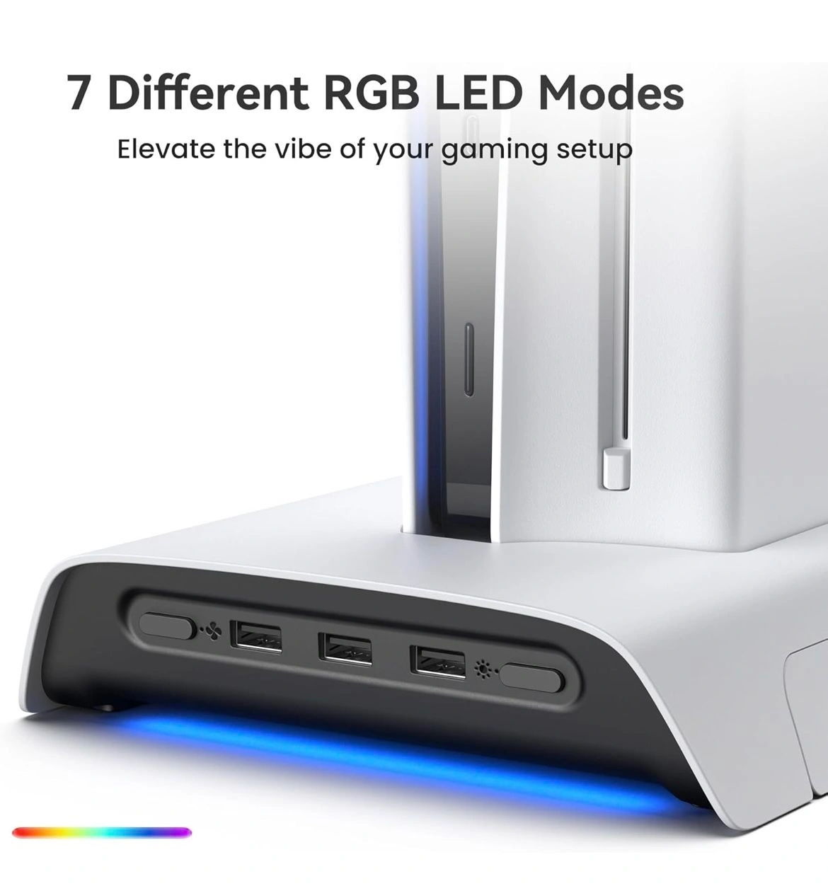 15Open box Controller Charging Station with Magnetic Dongles, Vertical Stand with High-Speed Cooling Fan and RGB for PS5 Slim Accessories.