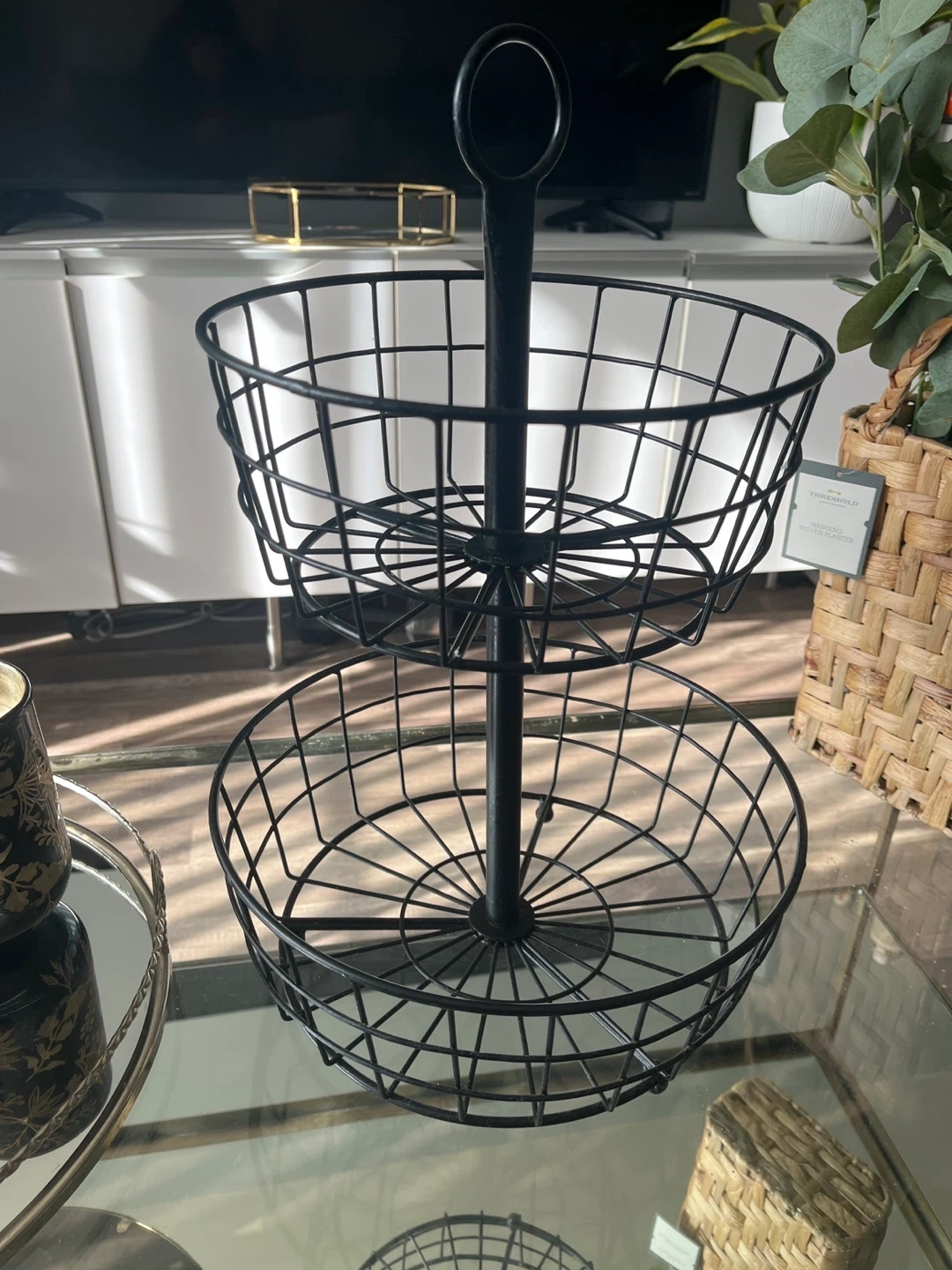 Add a touch of modern farmhouse charm to your kitchen with this Threshold two-tier wire basket! Perfect for storing fruits, veggies, or pantry items, this stylish and functional piece will keep your countertops organized and clutter-free