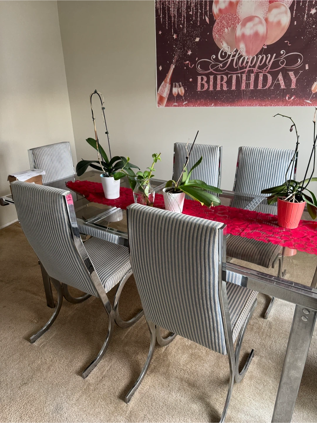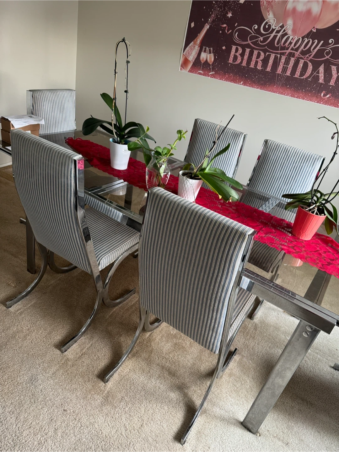 Buy & SellDining Table with 6 ChairsDining Table with 6 Chairs$233On sale - dining table with six chairs. The chairs have a striped pattern and chrome legs. The table has a glass top. Perfect for a dining room!1 chats·2 favorites·99 viewsSELLERKarlaNorth Babylon151 reviewWHERE TO MEETCheck Location
