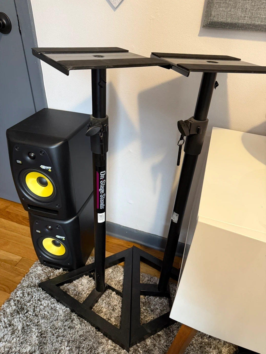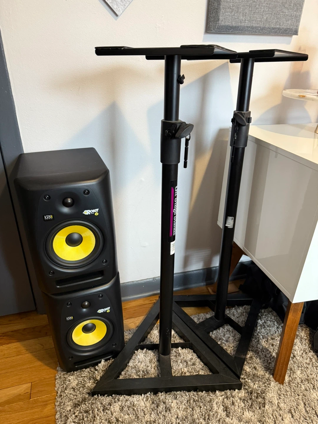 Selling a pair of used KRK Rokit 6 RPG2 powered studio monitor speakers. They are in great condition and ready to use for your studio setup! These speakers deliver clear and powerful sound, perfect for mixing and mastering. Also included are On Stage Stands.