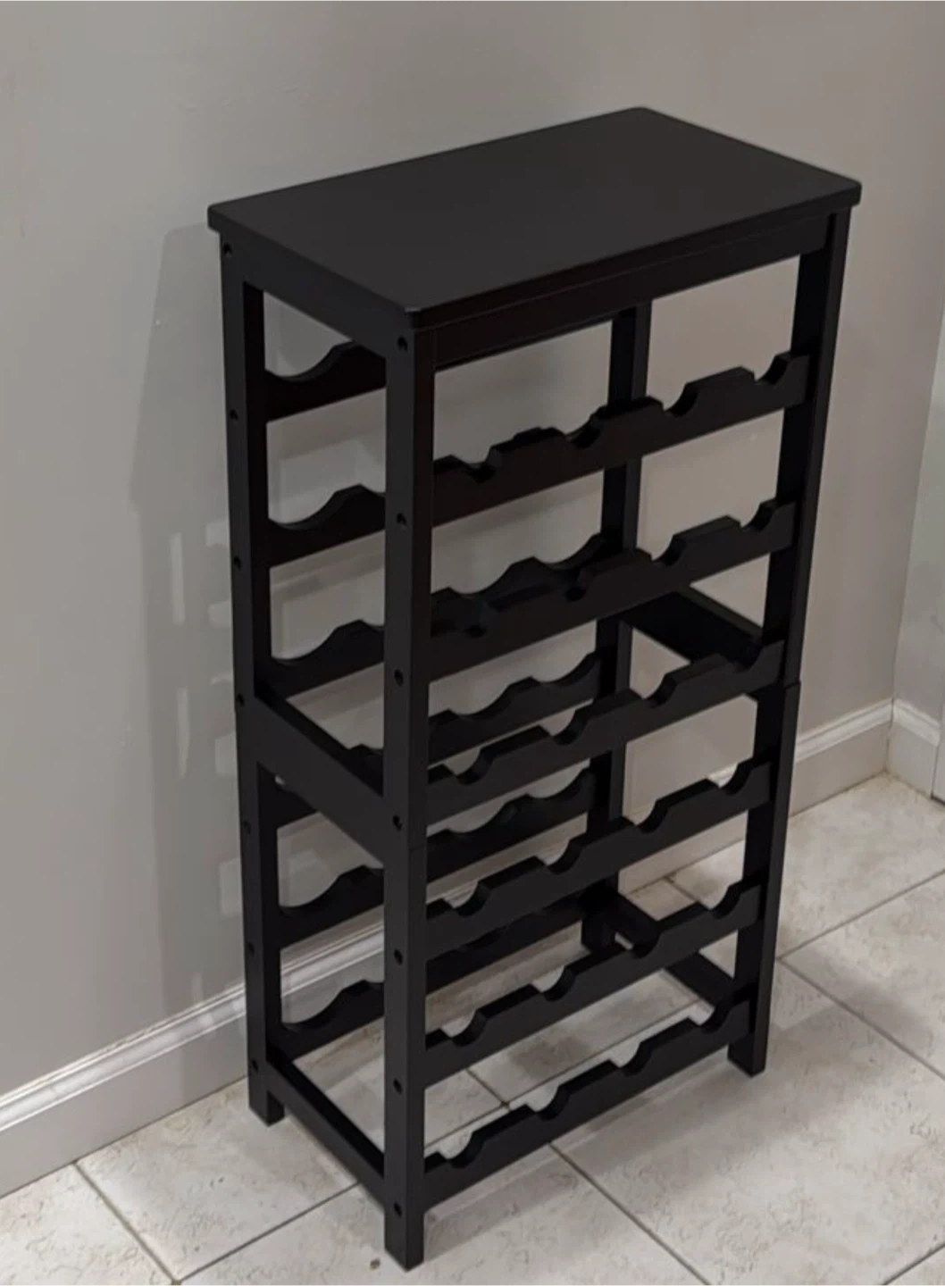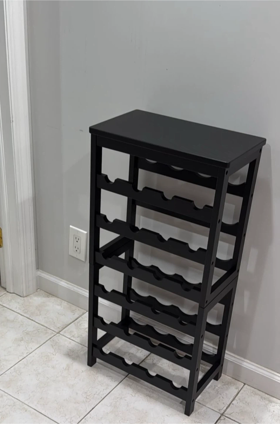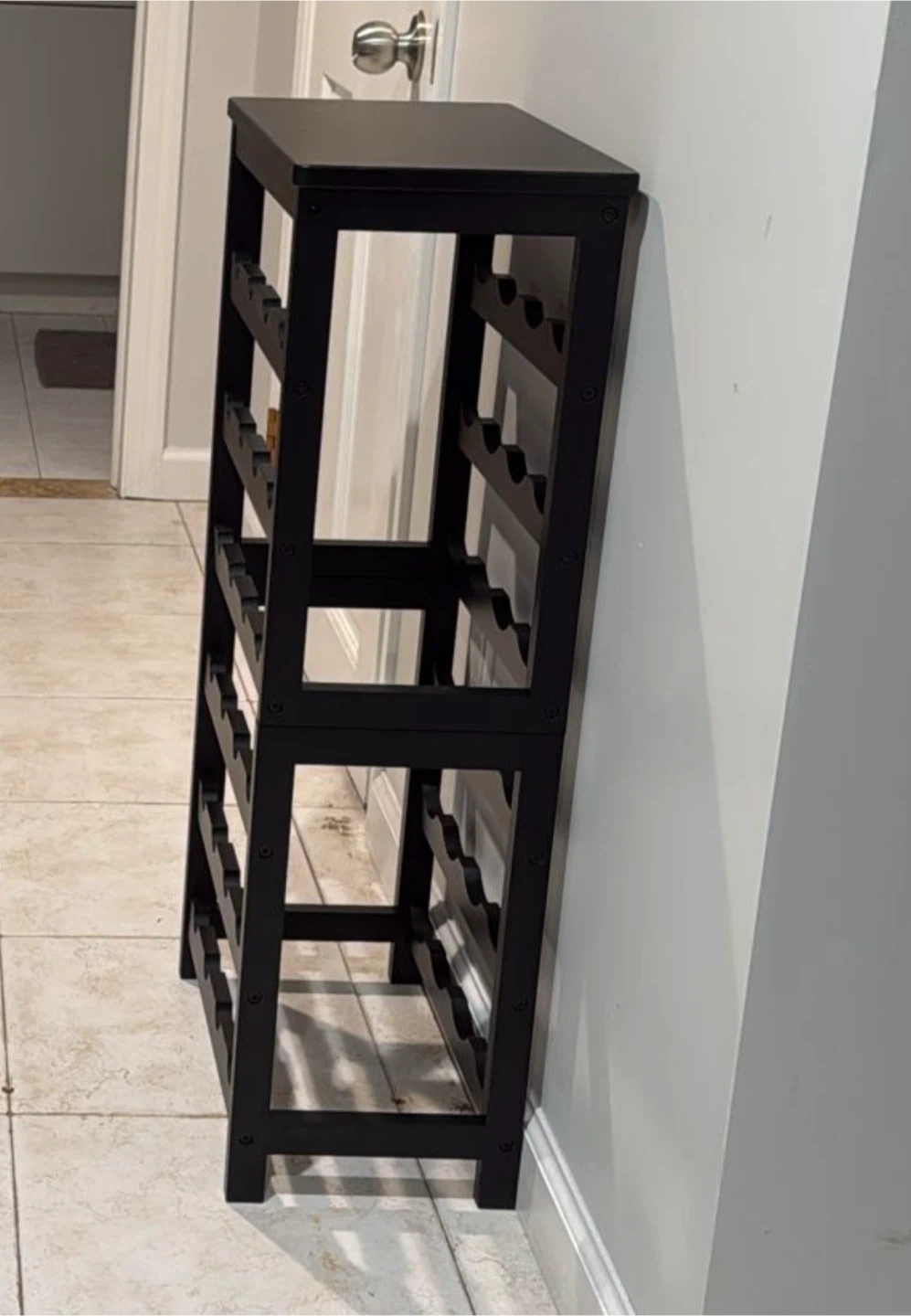 I'm selling a black VASMIA wine rack. This is a freestanding floor model with 6 tiers, perfect for displaying and storing your wine collection. It can hold up to 24 bottles. Great for a kitchen, bar, dining room, or living room