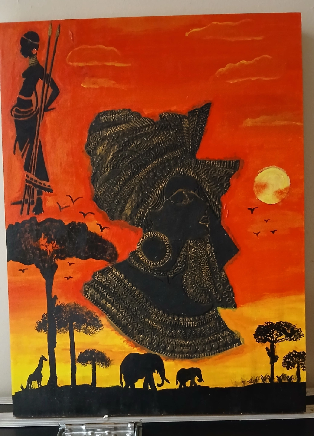 This is a beautiful African art painting with a vibrant sunset background, featuring silhouettes of people and animals. It would make a great addition to any home 18 1/8 de ancho x 25 in