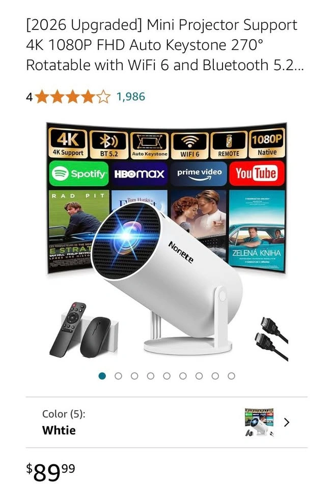 [2026 Upgraded] Mini Projector Support 4K 1080P FHD Auto Keystone 270° Rotatable with WiFi 6 and Bluetooth 5.2 Projector Portable Compatibile with HDMI/TV Stick/Memory Stick/Laptop, Black