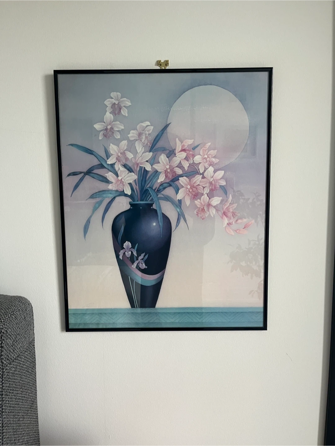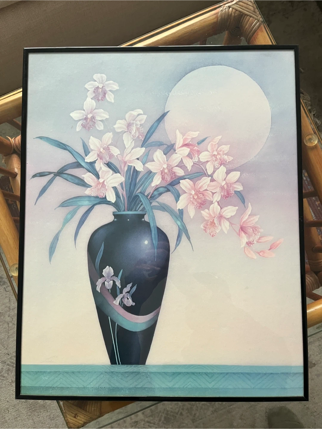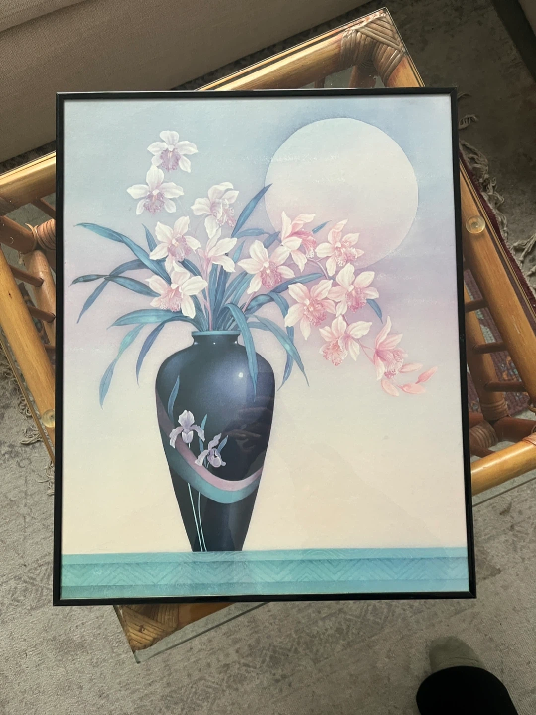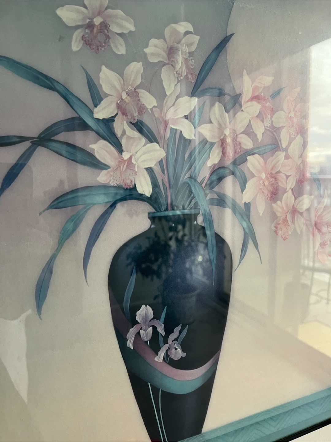 A lovely framed print featuring a floral arrangement in a vase against a soft, dreamy background. The frame is black and the print is in great condition with top glass encasing. Ready to add a touch of elegance to your home decor or collection. 16 W x 20 H
