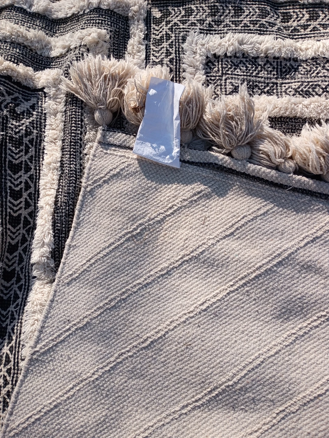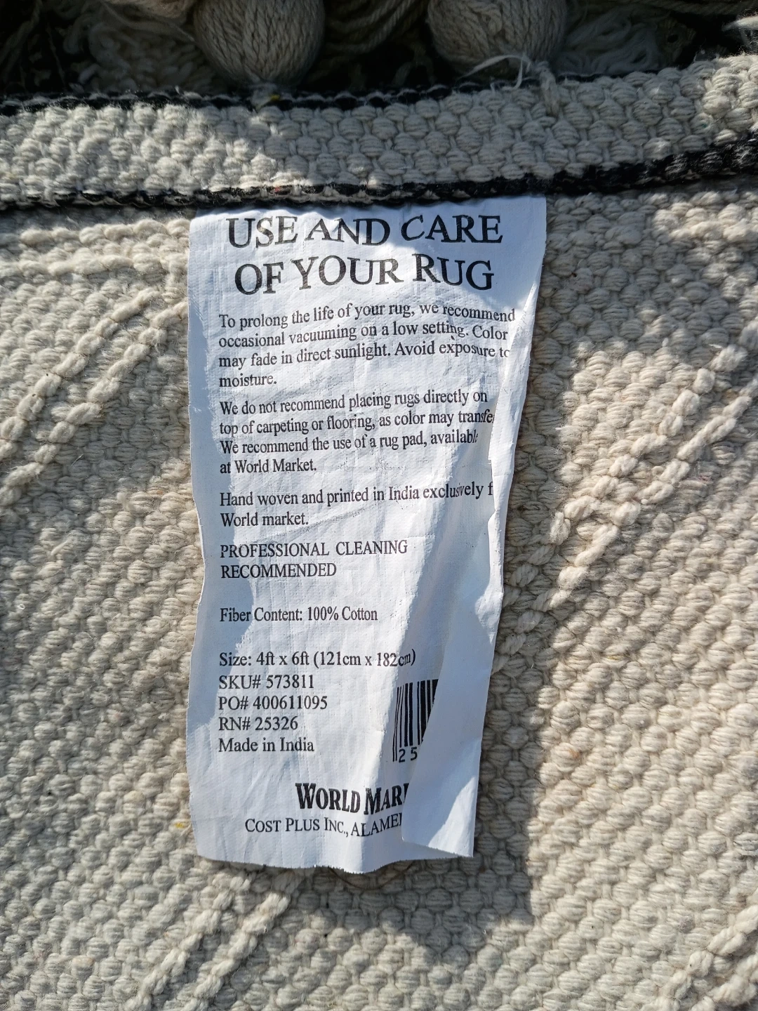 Selling a World Market rug from India that measures 4ft x 6ft (121cm x 182cm). It's made of 100% cotton and has a really cool Boho design with tassels. It's in great condition and would look awesome in any room!