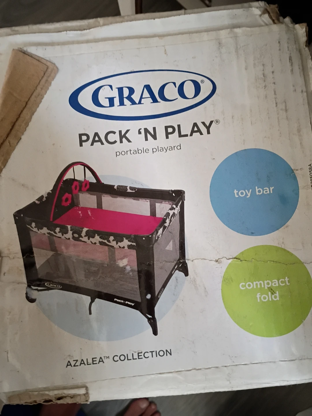 Selling a Graco Pack 'n Play portable playard from the Azalea Collection! It features a toy bar and a compact fold, making it easy to store and transport. The box also mentions a removable full-size infant bassinet for naps at home and away. The push-button fold makes it simple and quick to close. It also has wheels to make it easy to move from room to room