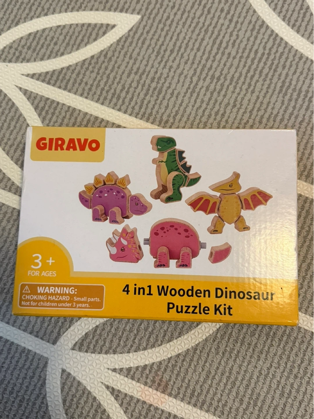 I'm selling a brand new GIRAVO 4 in 1 Wooden Dinosaur Puzzle Kit! This kit is perfect for kids 3+ years old. It comes in its original box.