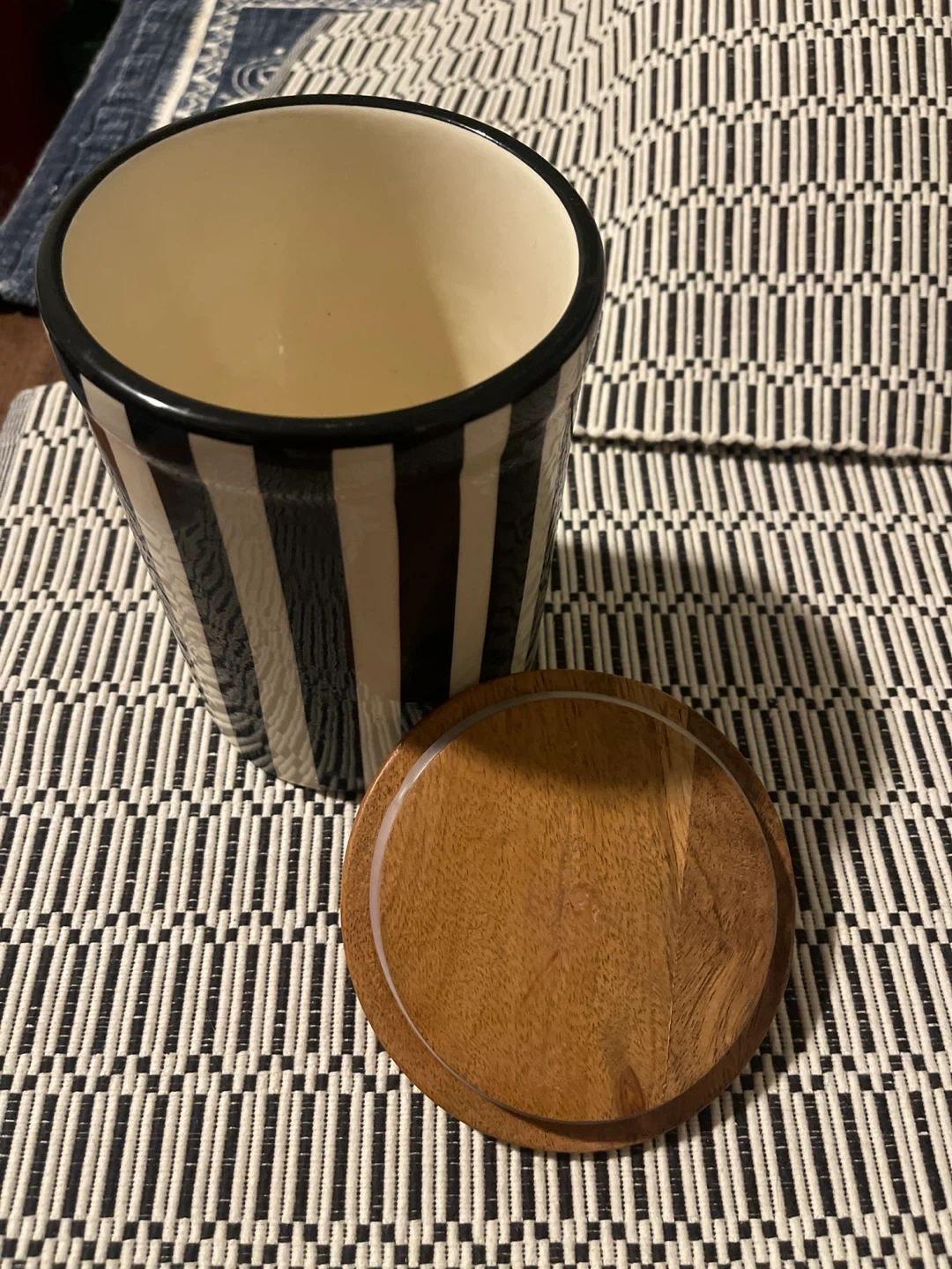 Selling a cute striped ceramic jar that comes with a wooden lid! It's perfect for storing small items or adding a touch of style to your space. The jar has a black and white striped pattern, and the lid is made of wood