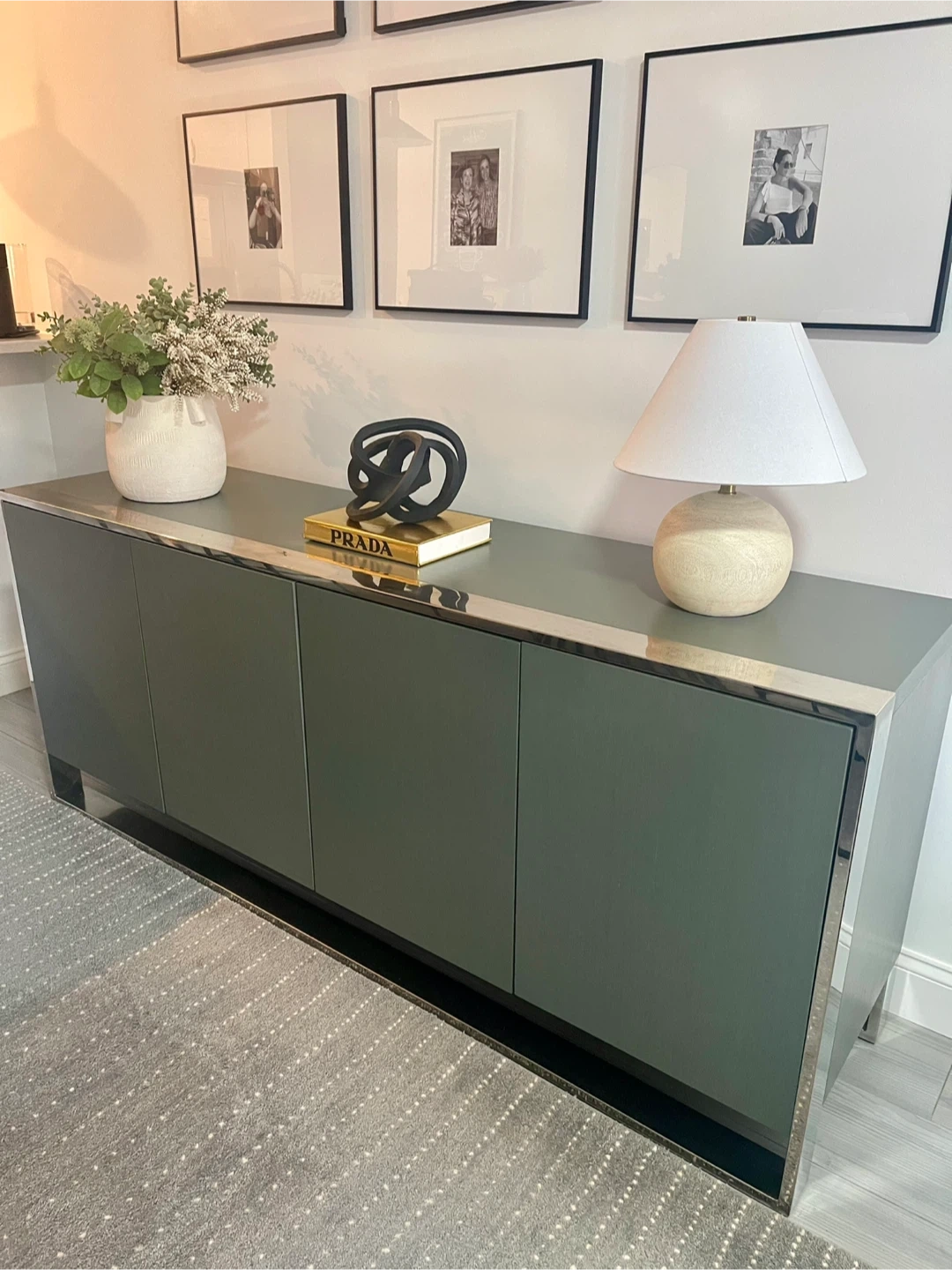 Selling a stylish gray cabinet that features a sleek silver trim. It's in great shape and would look lovely in any room! Perfect for storage or as a statement piece