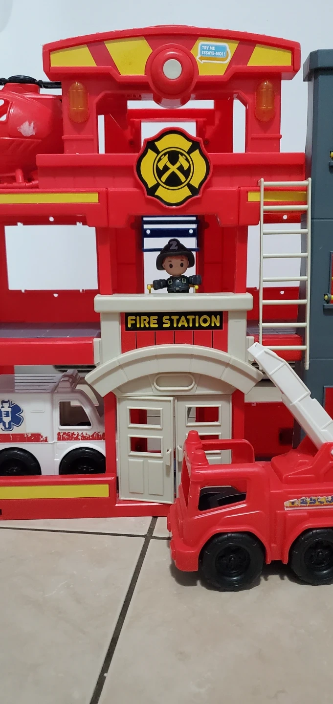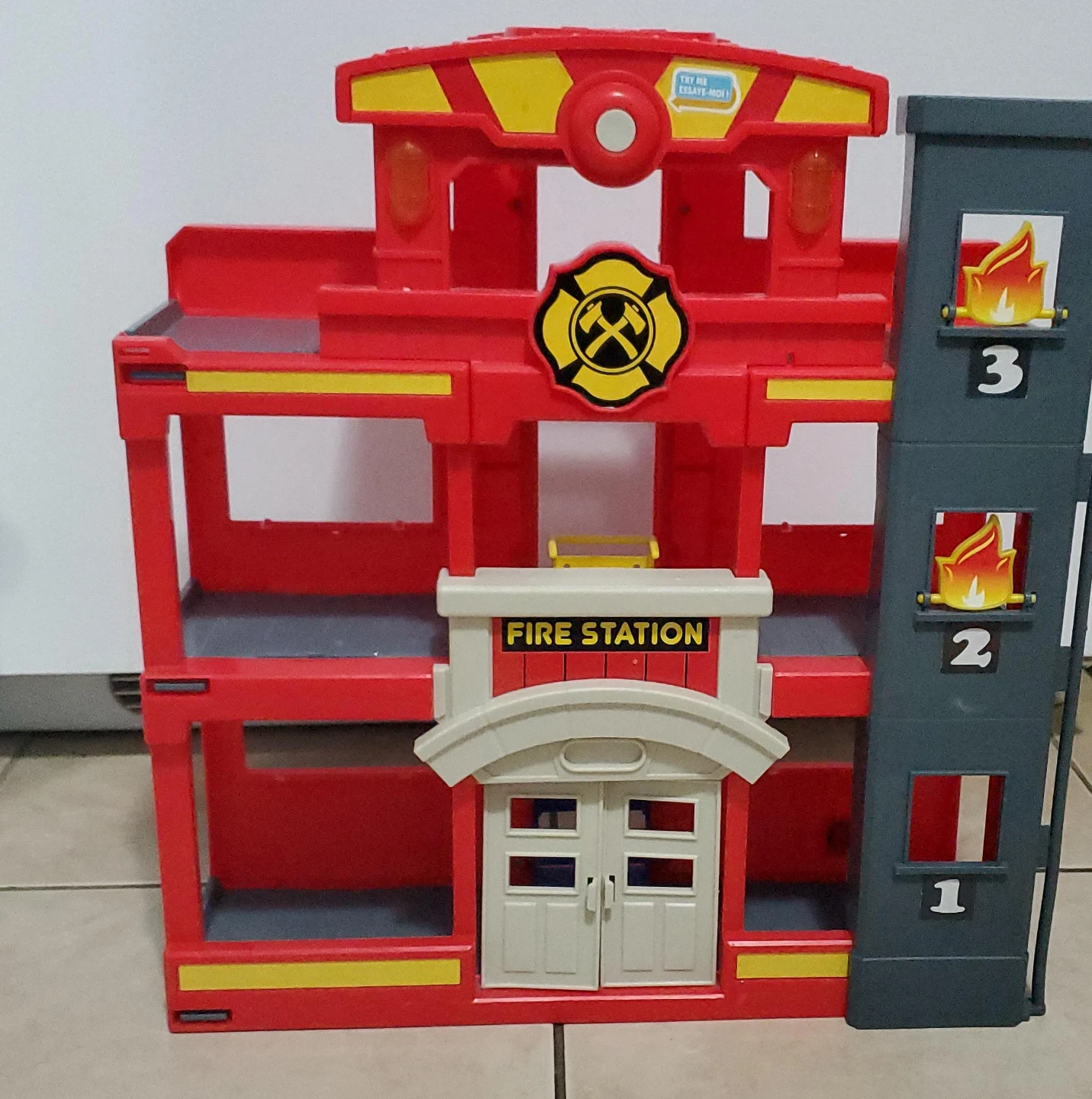 Lights, siren everything works and amuse children with a mimic of fire truck and police sirens, and ambulance. A fun fire station playset ready for a new home! It features a multi-level design with parking bays and a tower with numbered windows and a hlicopter. Great for imaginative play!