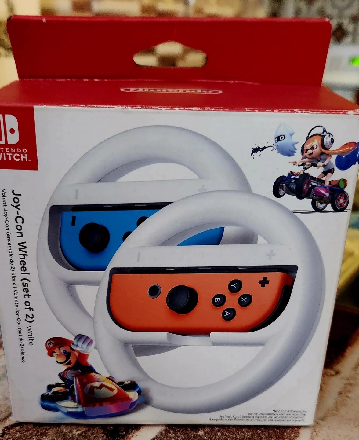 Get ready to race with this set of two white Joy-Con wheels for your Nintendo Switch! These wheels convert your Joy-Con controllers into steering wheels, perfect for racing games. They're compatible with Nintendo Switch Joy-Cons, and the box is included