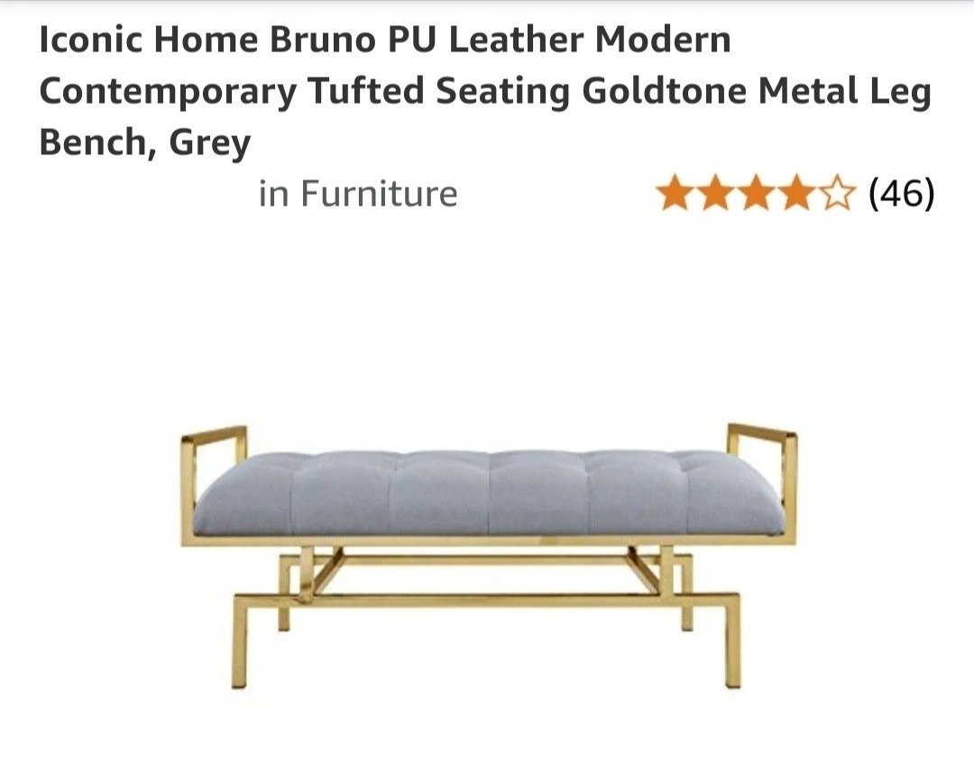 Selling an Iconic Home Bruno bench! It features a modern, contemporary design with tufted seating. The legs are a beautiful goldtone metal, and the upholstery is a grey PU leather. Perfect for adding a touch of elegance to any room