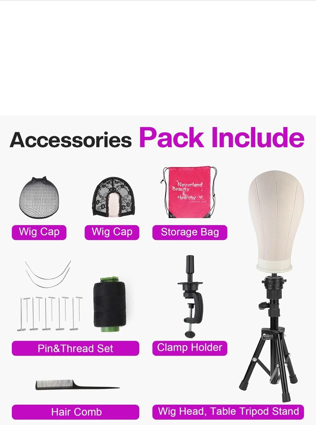 Selling a Neverland Beauty training head mannequin. It's 23 inches and comes with a wig head and table tripod stand. Also included are accessories like wig caps, a pin & thread set, a clamp holder, and a hair comb. It also comes with its original box!