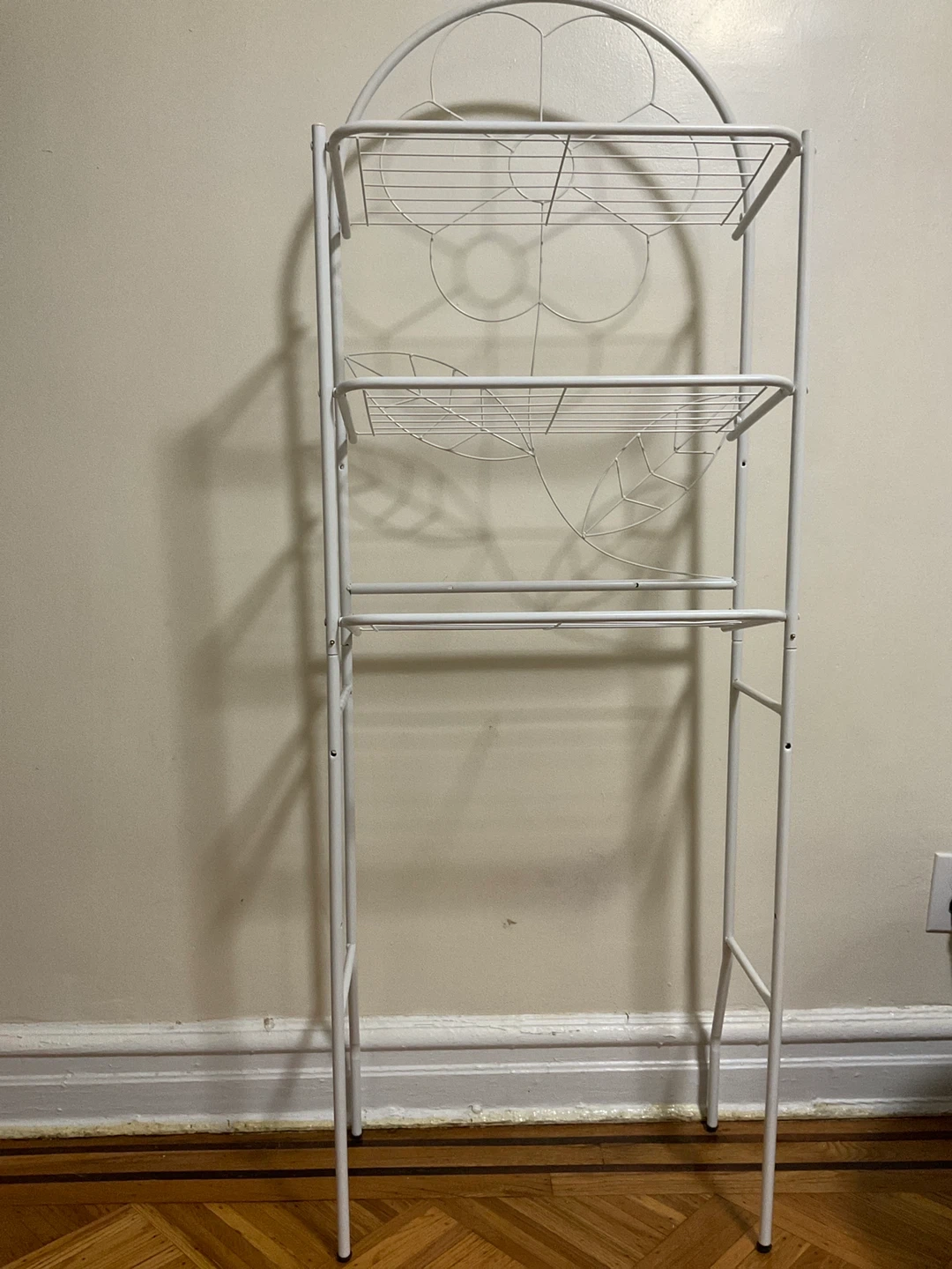 This is a white over-the-toilet space saver. It's a great way to add extra storage to your bathroom. It has three shelves, so you can store all of your bathroom essentials. It's in good condition and ready for a new home