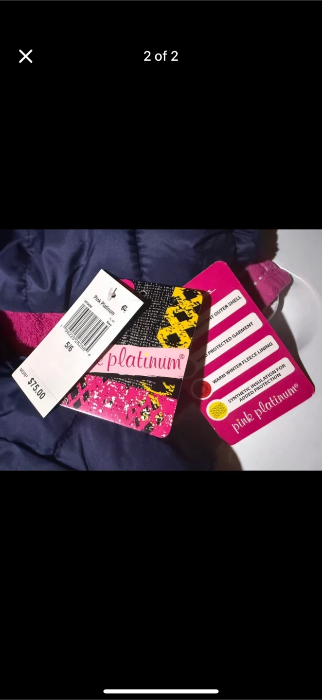 This is a Pink Platinum girls' puffer jacket in size 5/6. It features a wind-protected garment and warm winter fleece lining. Originally priced at $75.00, this jacket offers synthetic insulation for added protection. It's a great choice for keeping your little one warm and cozy! BRAND NEW!!