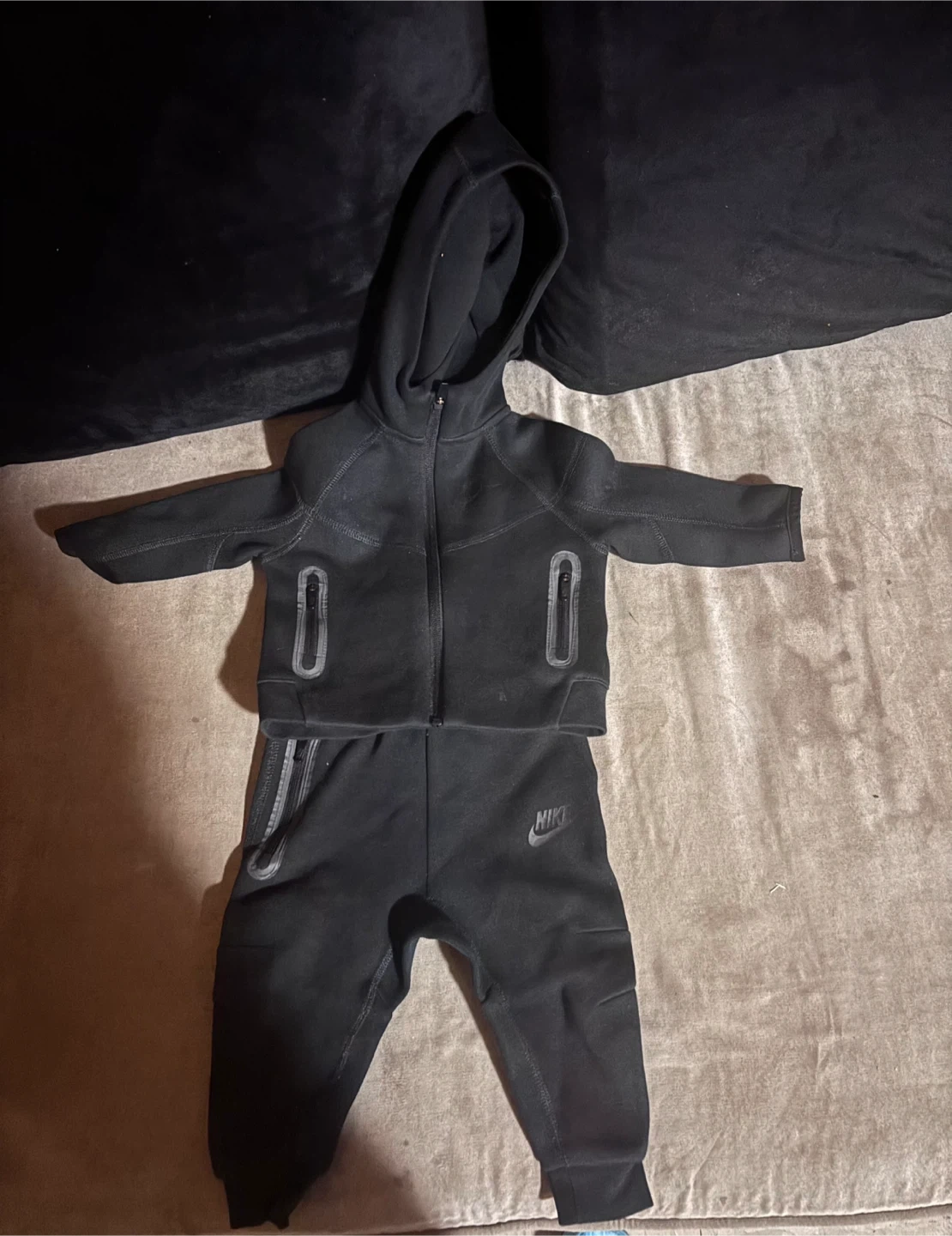 Selling a Nike Tech Fleece baby set in black! It's a super cute and comfy outfit for your little one. The set includes a hoodie and pants, perfect for keeping them warm and stylish.