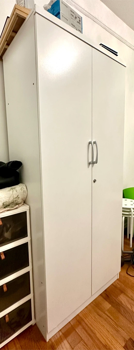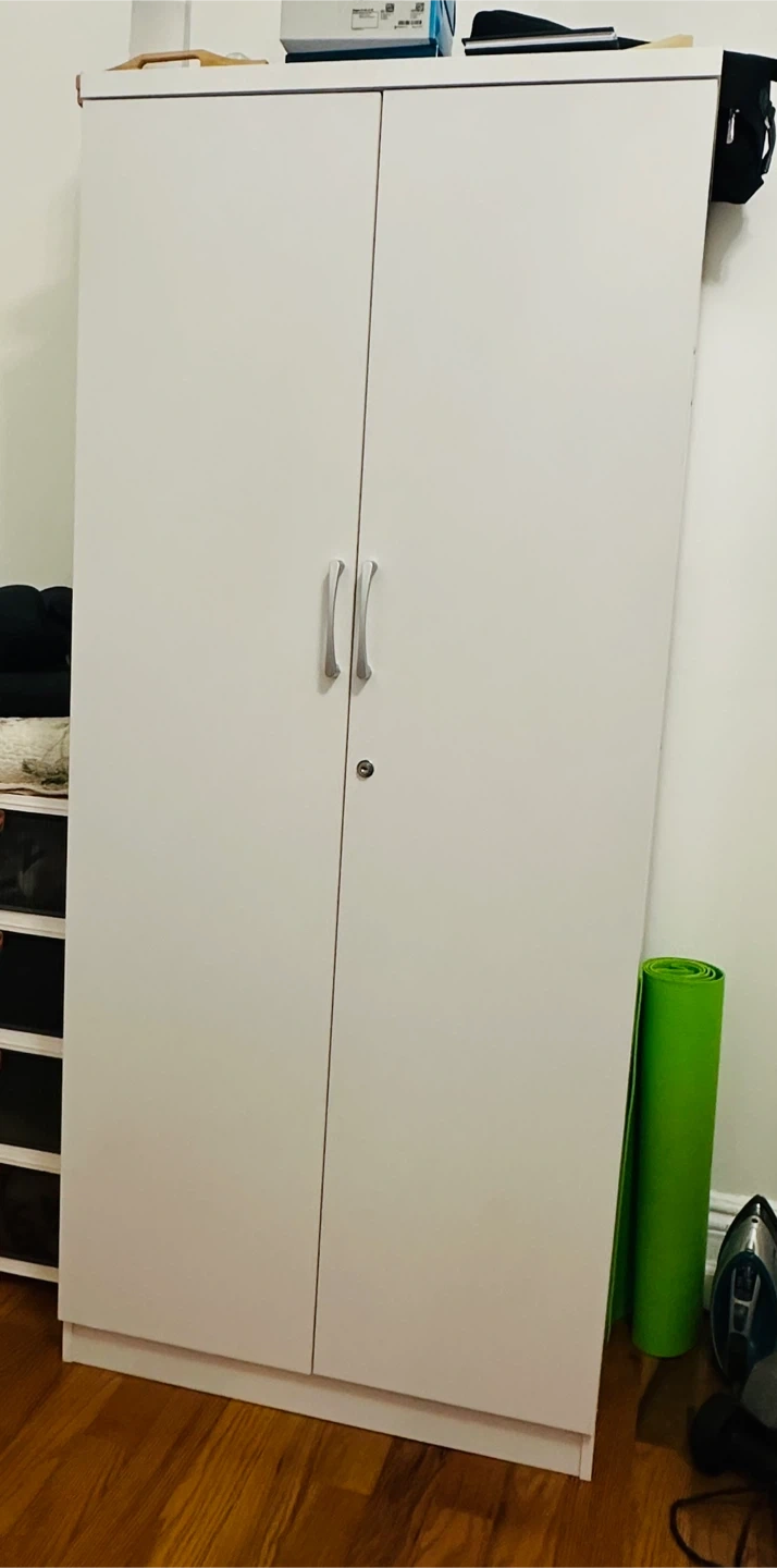 Clean and simple white two-door storage cabinet — perfect for clothes, linens, or general household storage.