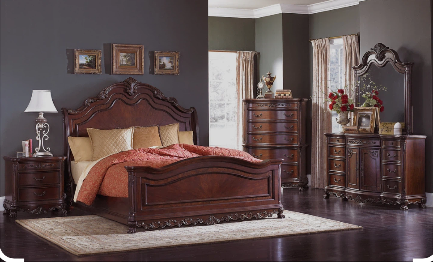 Elegant bedroom set in great condition! Includes a beautifully crafted bed frame, a spacious dresser with ample storage, and a matching nightstand. Perfect for adding a touch of classic style to your bedroom