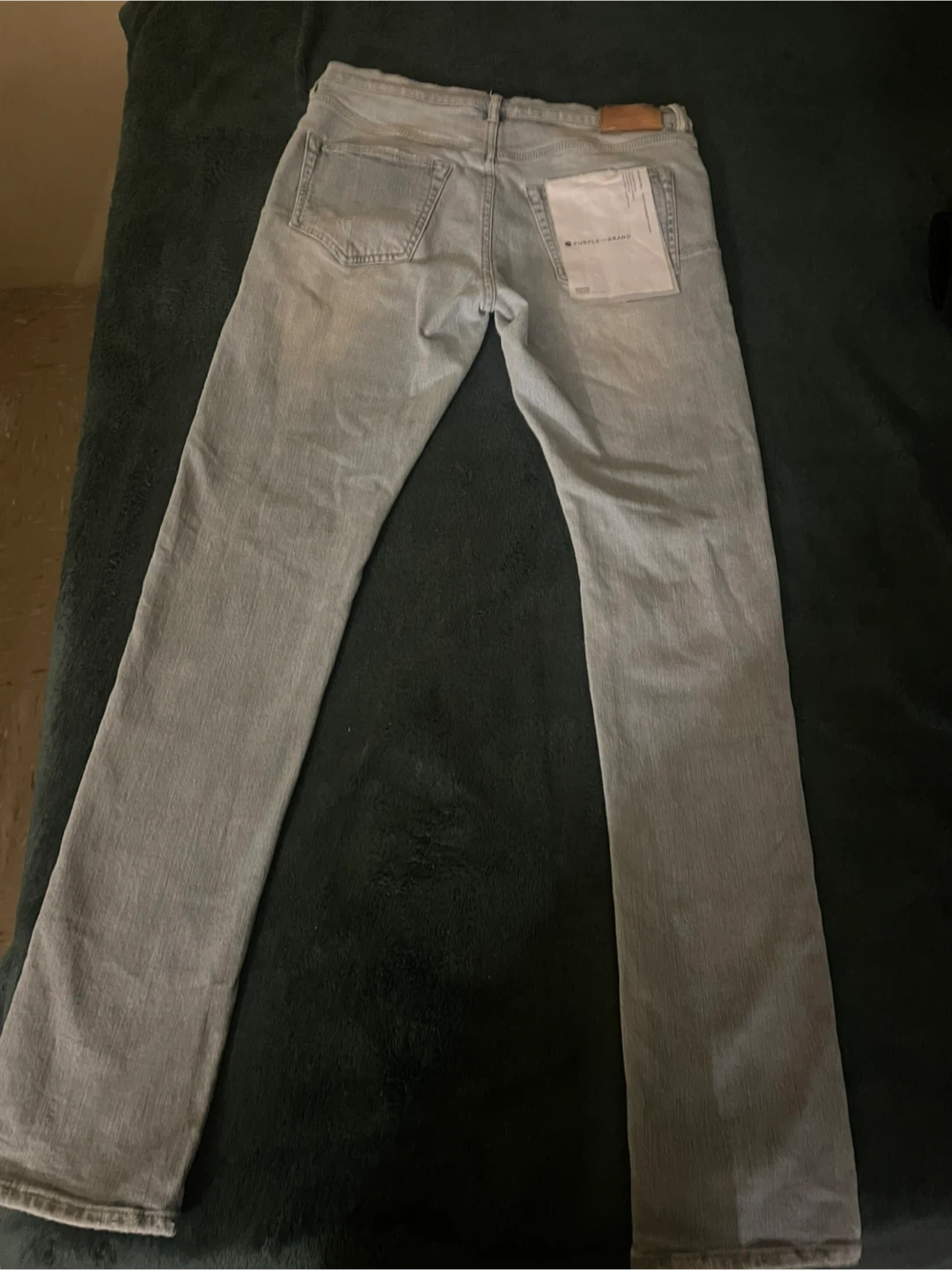 Selling a pair of Purple Brand light wash denim jeans with a distressed look. They have a unique style and are perfect for a casual outfit. Check out the photos for details!