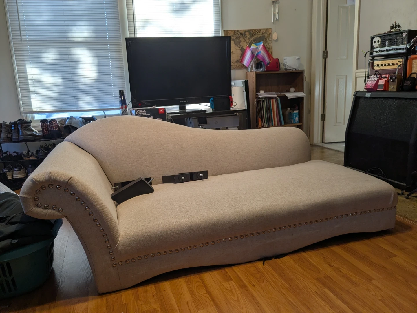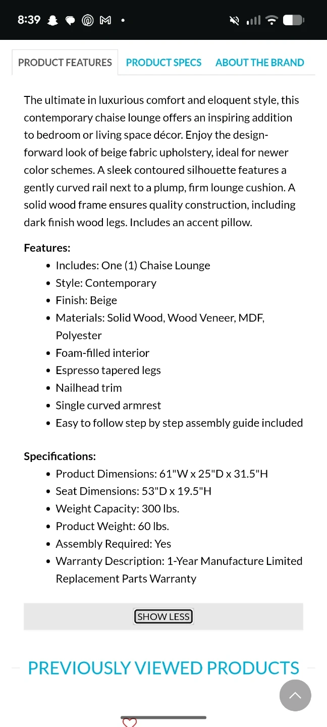 Looking to add a touch of elegance to your living space? I'm selling a Bush Furniture Jazlyn Contemporary Fabric Nailhead Chaise Lounge in Beige. It's in good condition and ready for a new home!