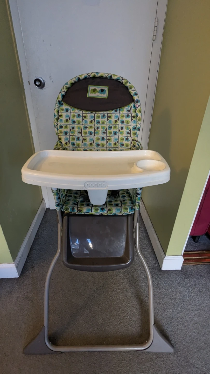 Selling a Cosco folding high chair! It's in great condition and perfect for meal times with your little one. The chair features a fun, colorful pattern and a convenient folding design for easy storage. The tray is easy to clean, making mealtime cleanup a breeze!