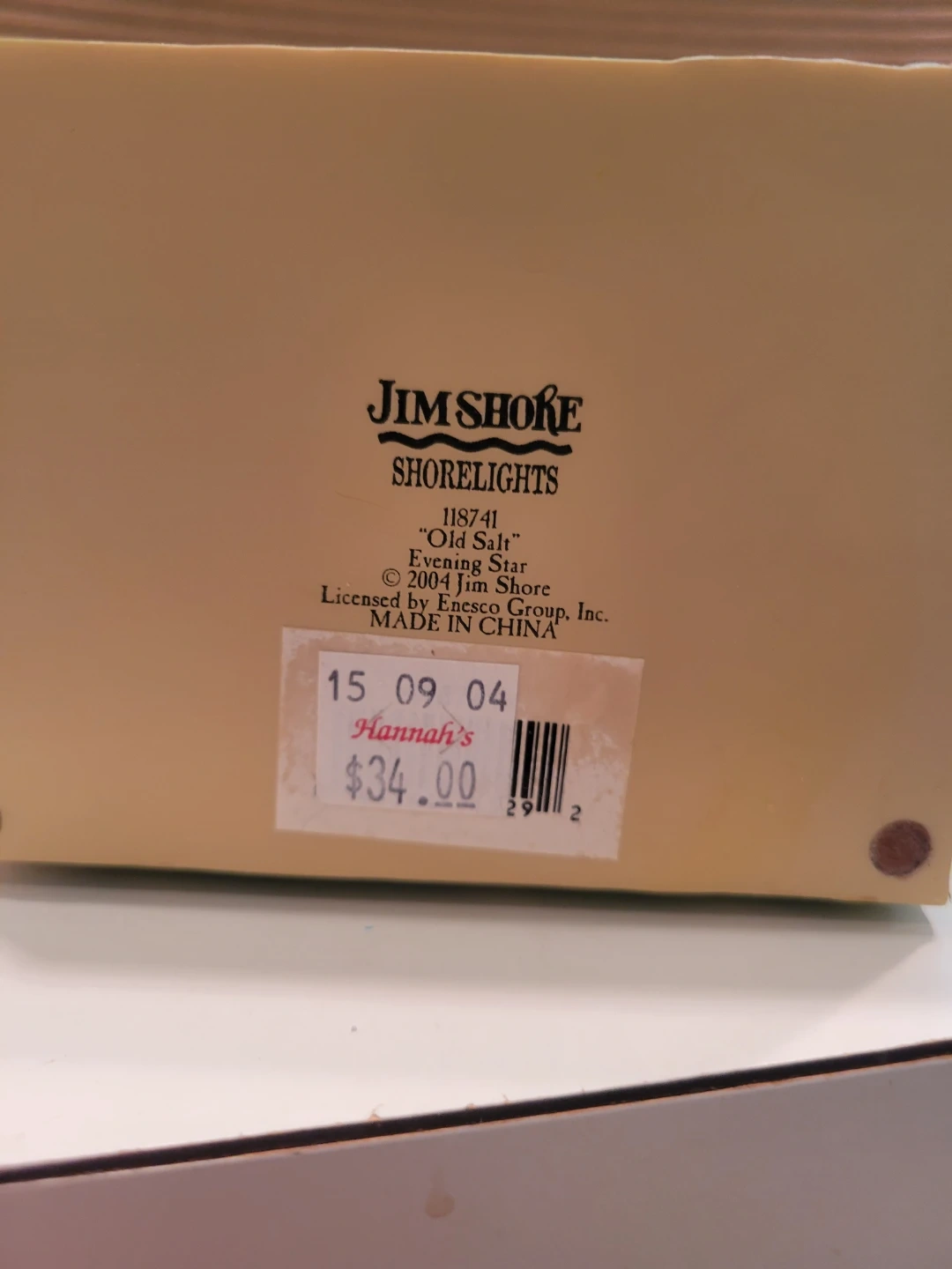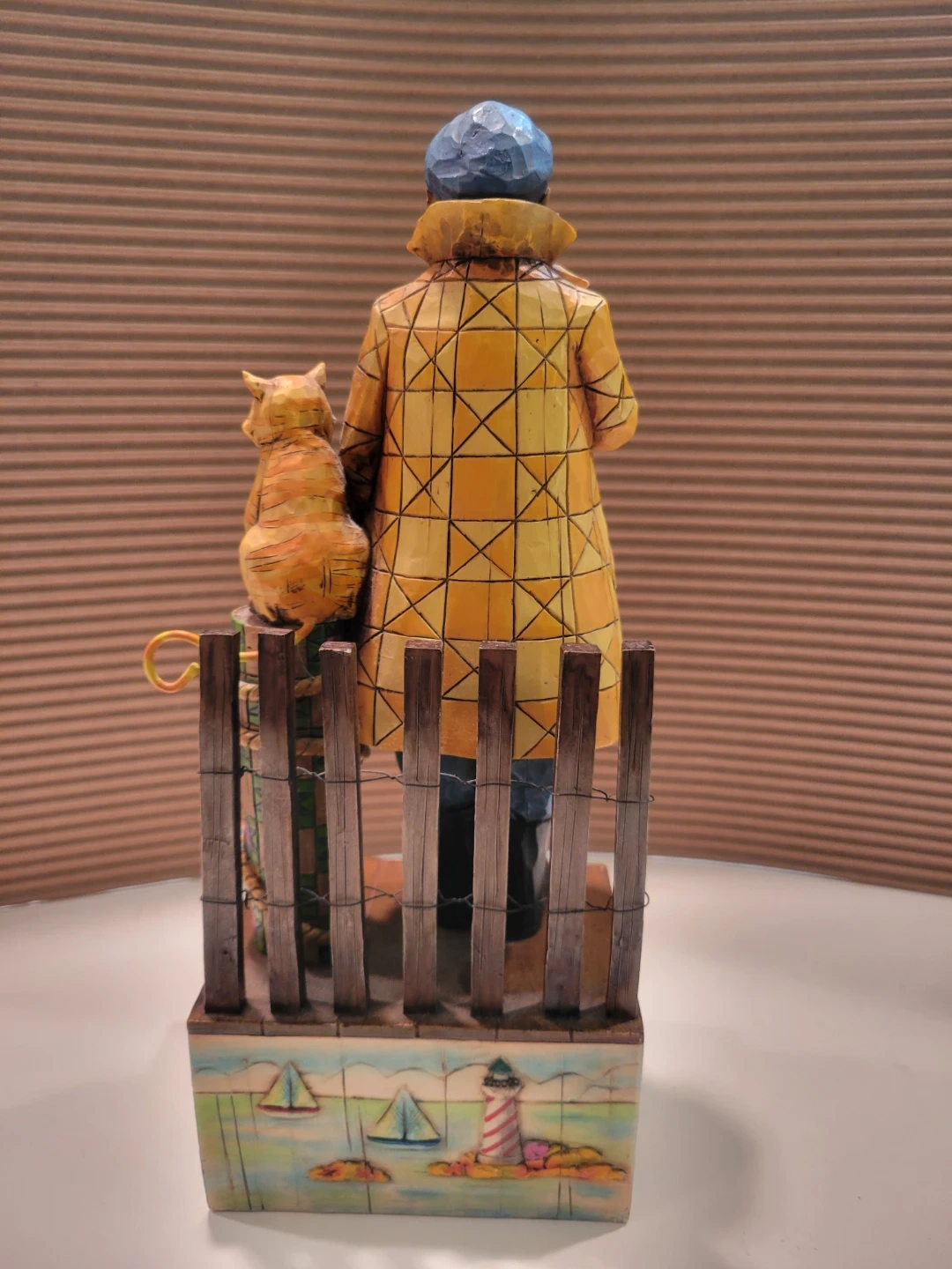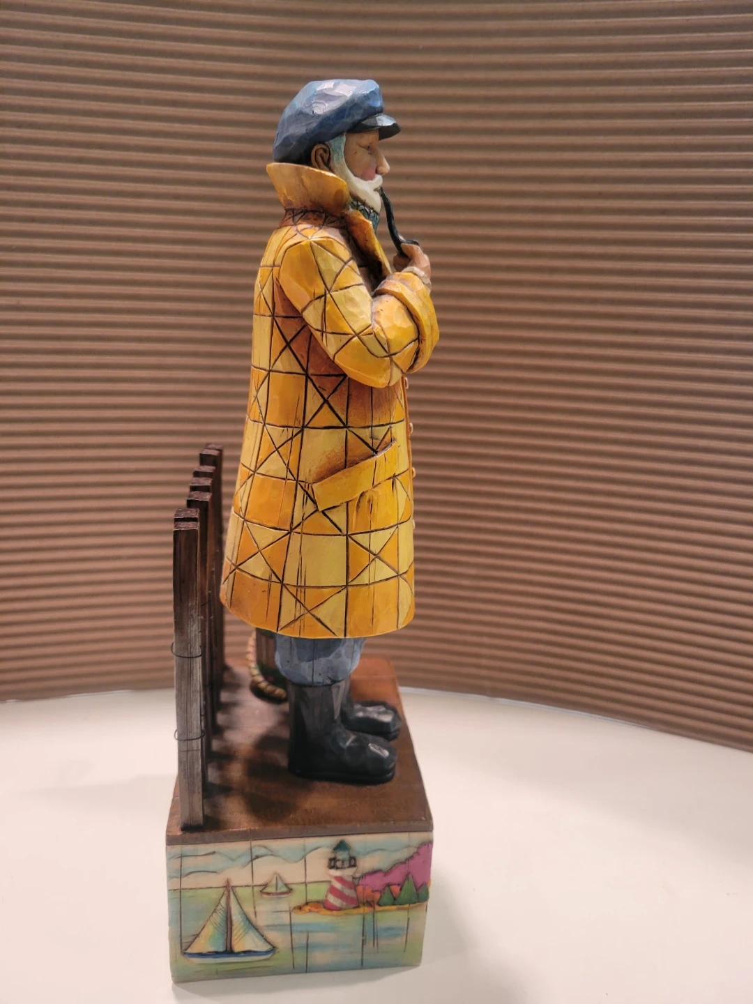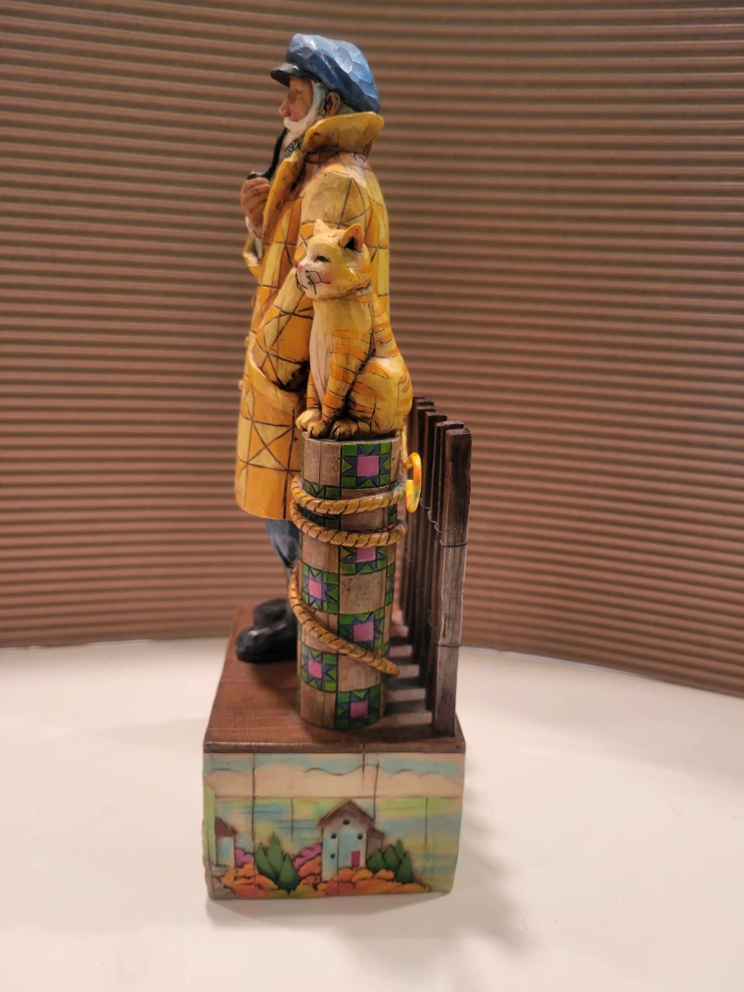 Selling a Jim Shore Shorelights figurine titled "Old Salt" from the Evening Star collection. This charming piece features a fisherman with a cat, standing on a dock with a seaside scene painted on the base. Originally bought for $34.00, it's a delightful addition to any collection! No Box- but we'll bubble wrapped in a substitute box.