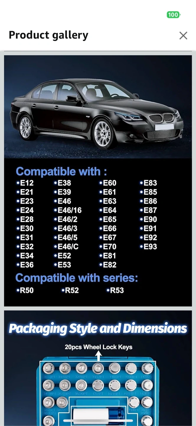 15This is a 20-piece wheel lock key set, compatible with a wide range of BMW models, including E12, E21, E23, E24, E28, E30, E31, E32, E34, E36, E38, E39, E46/16, E46/2, E46/3, E46/5, E46/C, E52, E53, E60, E61, E63, E64, E65, E66, E67, E70, E81, E82, E83, E85, E86, E87, E90, E91, E92, E93, R50, R52, and R53 Each key is made with high-quality materials and precision engineering to ensure a perfect fit and reliable performance