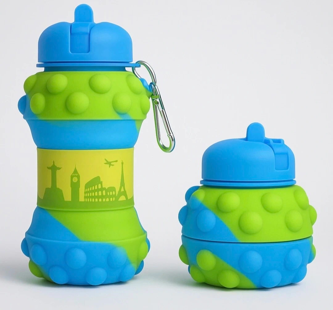 This kids’ silicone water bottle features a unique collapsible design that folds into a compact donut shape, perfect for saving space in backpacks or lunch bags. Made from soft, flexible, BPA-free silicone, it offers a comfortable grip for little hands.