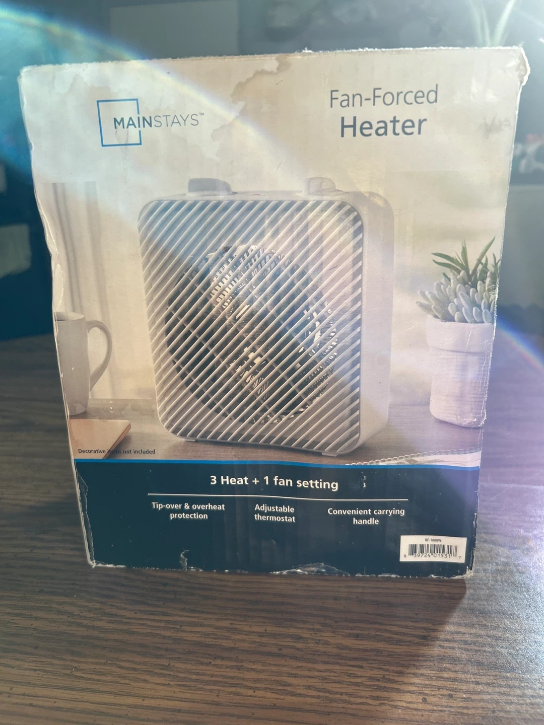 Selling a Mainstays fan-forced heater. It has 3 heat settings plus a fan-only setting. It also features tip-over and overheat protection, and a convenient carrying handle.